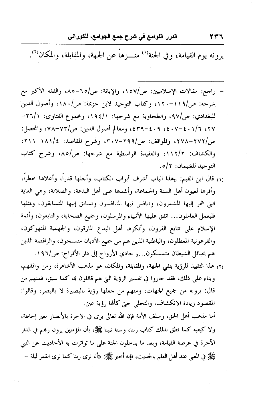 (٢) هذا التقييد للرؤية بنفي الجهة، والمقابلة، والمكان، هو مذهب الأشاعرة، ومن وافقهم، وبناء على ذلك، فقد حاروا في تفسير الرؤية التي هم قائلون بها كما سبق، فمنهم من قال: يرونه من جميع الجهات، ومنهم من جعلها رؤية بالبصيرة لا بالبصر، وقالوا: المقصود زيادة الانكشاف، والتجلي حتى كأنها رؤية عين.