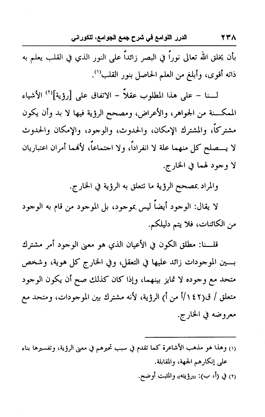 قلنا: مطلق الكون في الأعيان الذي هو معنى الوجود أمر مشترك بين الموجودات زائد عليها في التعقل، وفي الخارج كل هوية، وشخص متحد مع وجوده لا تمايز بينهما، وإذا كان كذلك صح أن يكون الوجود متعلق الرؤية، لأنه مشترك بين الموجودات، ومتحد مع معروضه في الخارج.