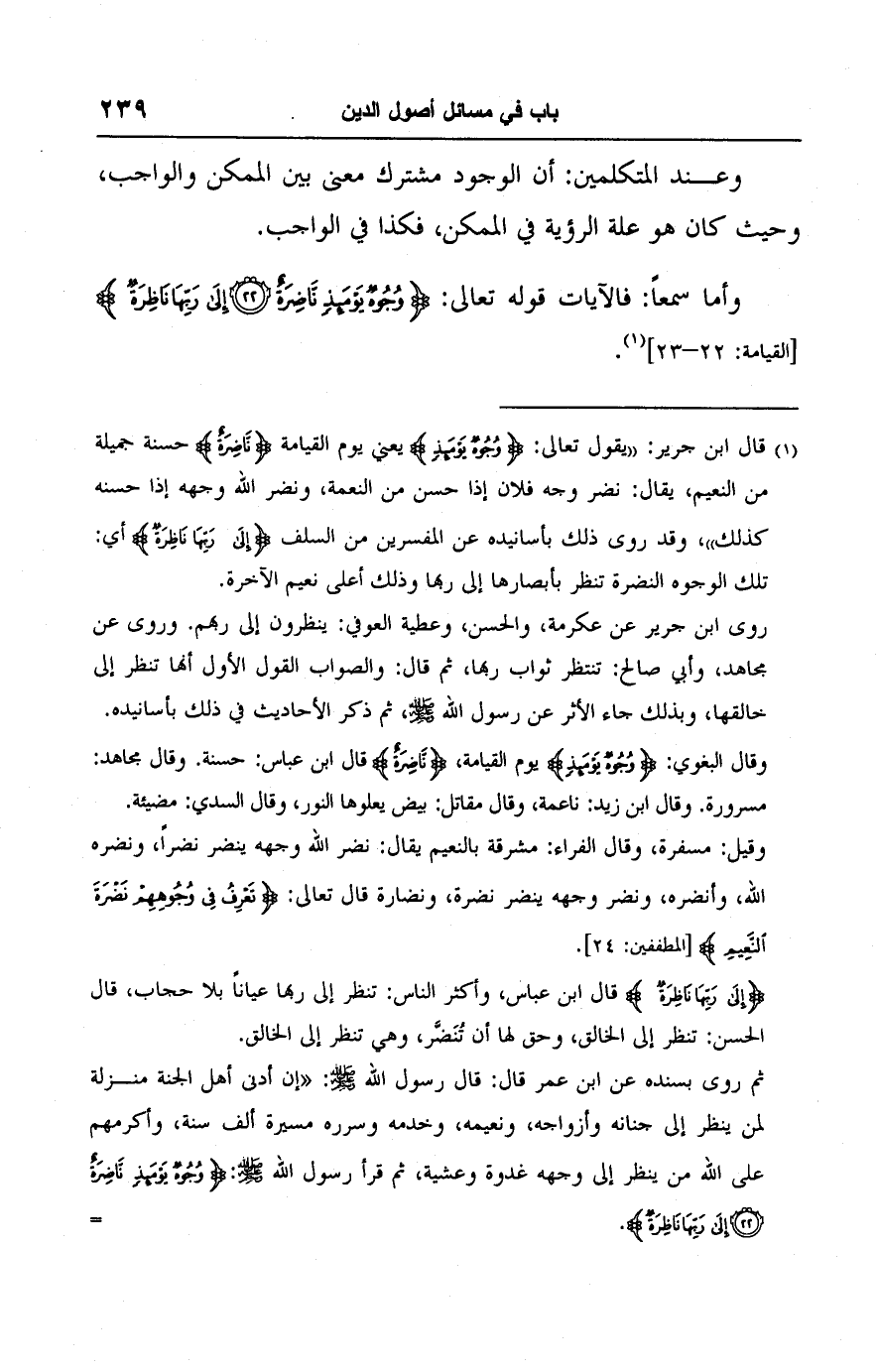 روى ابن جرير عن عكرمة، والحسن، وعطية العوفي: ينظرون إلى ربهم. وروى عن مجاهد، وأبي صالح: تنتظر ثواب ربها، ثم قال: والصواب القول الأول أنها تنظر إلى خالقها، وبذلك جاء الأثر عن رسول اللَّه -صلى اللَّه عليه وسلم-، ثم ذكر الأحاديث في ذلك بأسانيده.