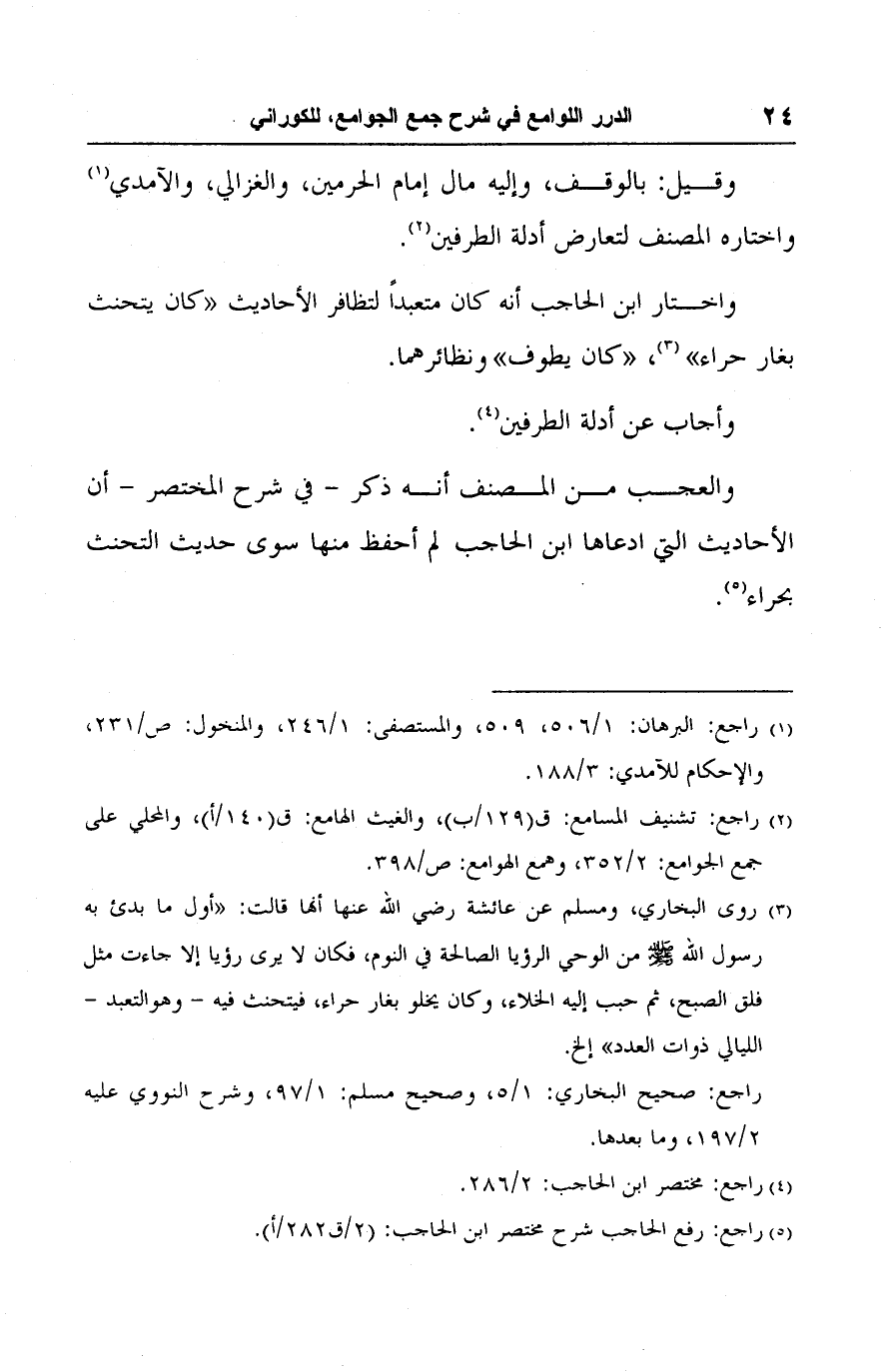 واختار ابن الحاجب أنه كان متعبدًا لتظافر الأحاديث "كان يتحنث بغار حراء" (٣)، "كان يطوف" ونظائرهما.