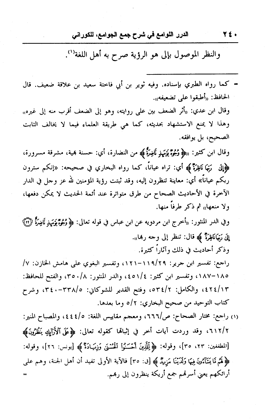 وقال ابن كثير: " {وُجُوهٌ يَوْمَئِذٍ نَاضِرَةٌ} من النضارة، أي: حسنة بهية، مشرقة مسرورة، {إِلَى رَبِّهَا نَاظِرَةٌ} أي: تراه عيانًا، كما رواه البخاري في صحيحه: "إنكم سترون ربكم عيانًا" أي: معاينة تنظرون إليه، وقد ثبتت رؤية المؤمنين للَّه عز وجل في الدار الآخرة في الأحاديث الصحاح من طرق متواترة عند أئمة الحديث لا يمكن دفعها، ولا منعها" ثم ذكر طرفًا منها.