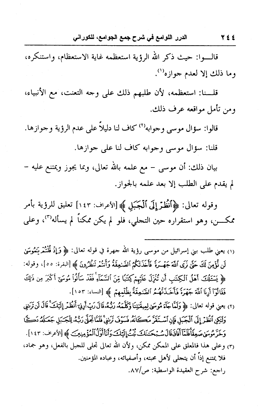(٣) وعلى هذا فالمعلق على الممكن ممكن، ولأن اللَّه تعالى تجلى للجبل بالفعل، وهو جماد، فلا يمتنع إذًا أن يتجلى لأهل محبته، وأصفيائه، وعباده المؤمنين.