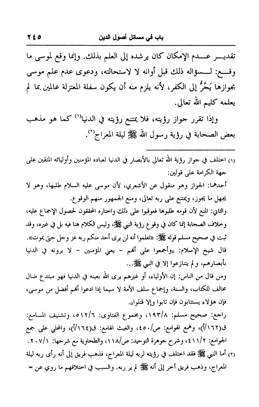 (١) اختلف في جواز رؤية اللَّه تعالى بالأبصار في الدنيا لعباده المؤمنين وأوليائه المتقين على جهة الكرامة على قولين: