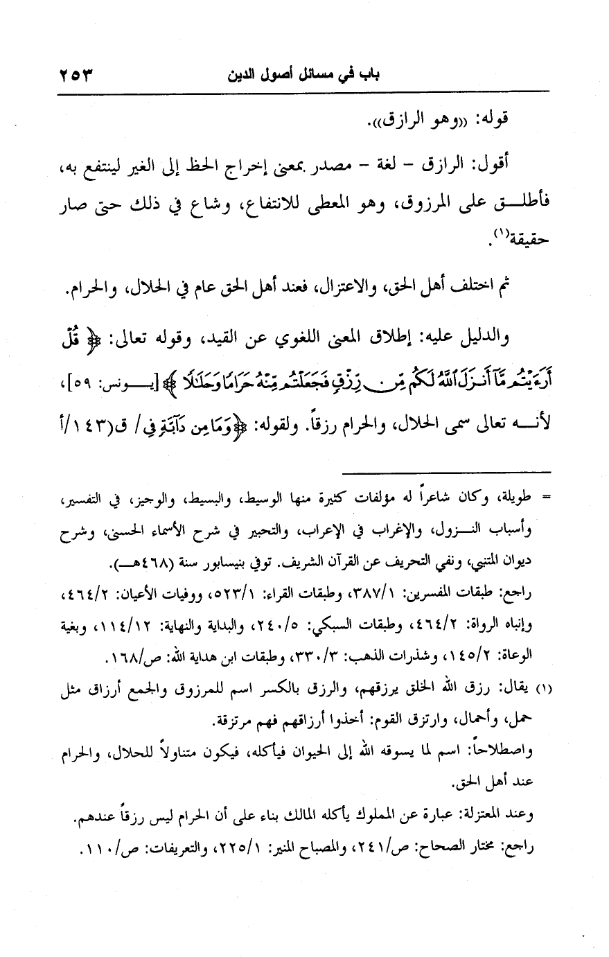 والدليل عليه: إطلاق المعنى اللغوي عن القيد، وقوله تعالى: {قُلْ أَرَأَيْتُمْ مَا أَنْزَلَ اللَّهُ لَكُمْ مِنْ رِزْقٍ فَجَعَلْتُمْ مِنْهُ حَرَامًا وَحَلَالًا} [يونس: ٥٩]، لأنه تعالى سمى الحلال، والحرام رزقًا. ولقوله: {وَمَا مِنْ دَابَّةٍ فِي