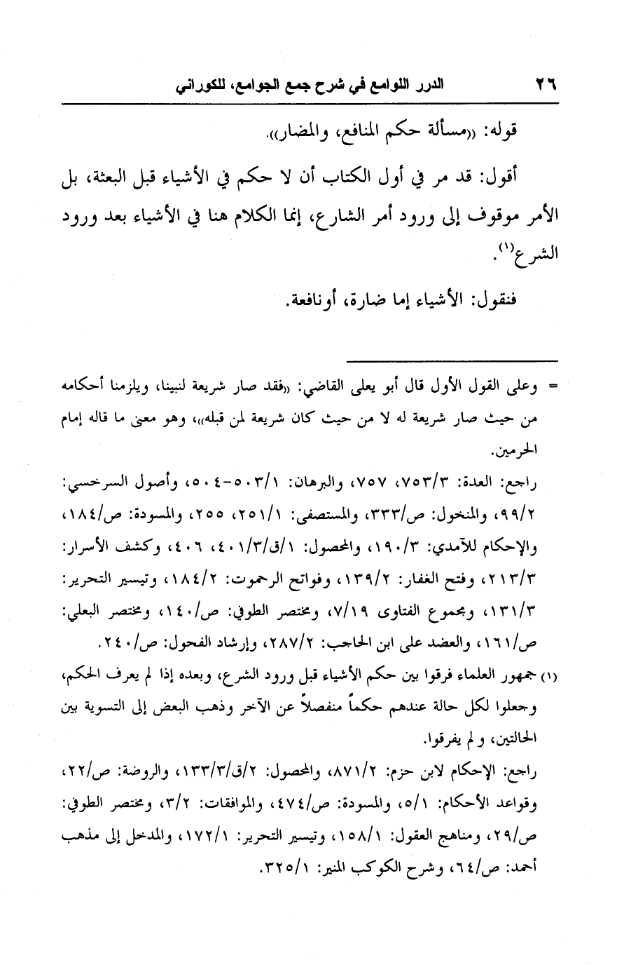 (١) جمهور العلماء فرقوا بين حكم الأشياء قبل ورود الشرع، وبعده إذا لم يعرف الحكم، وجعلوا لكل حالة عندهم حكمًا منفصلًا عن الآخر وذهب البعض إلى التسوية بين الحالتين، ولم يفرقوا.