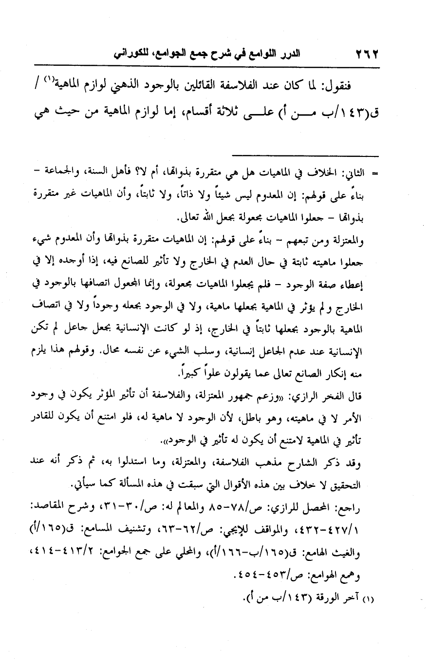 قال الفخر الرازي: "وزعم جمهور المعتزلة، والفلاسفة أن تأثير المؤثر يكون في وجود الأمر لا في ماهيته، وهو باطل، لأن الوجود لا ماهية له، فلو امتنع أن يكون للقادر تأثير في الماهية لامتنع أن يكون له تأثير في الوجود".