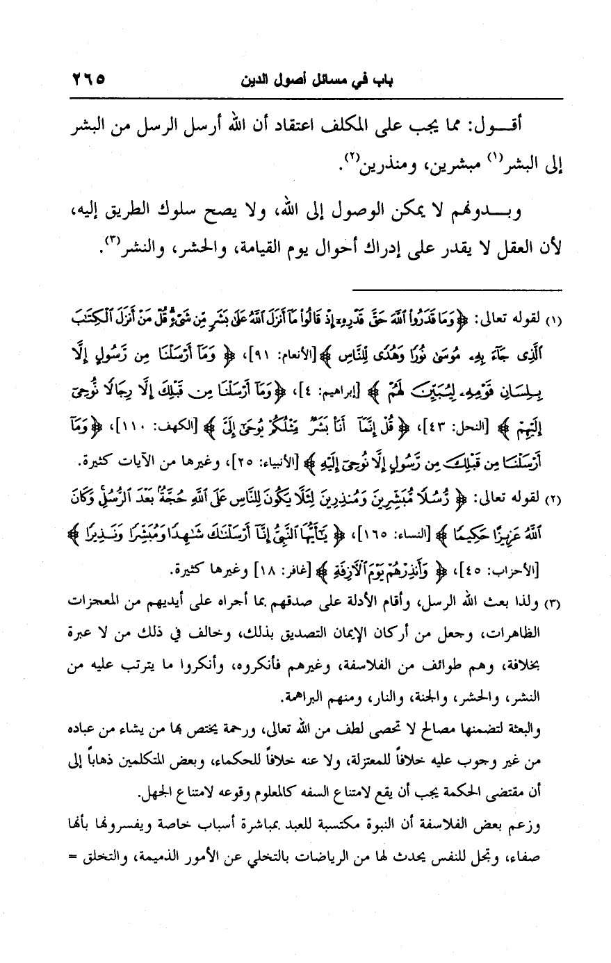 (٣) ولذا بعث اللَّه الرسل، وأقام الأدلة على صدقهم بما أجراه على أيديهم من المعحزات الظاهرات، وجعل من أركان الإيمان التصديق بذلك، وخالف في ذلك من لا عبرة بخلافة، وهم طوائف من الفلاسفة، وغيرهم فأنكروه، وأنكروا ما يترتب عليه من النشر، والحشر، والجنة، والنار، ومنهم البراهمة.
