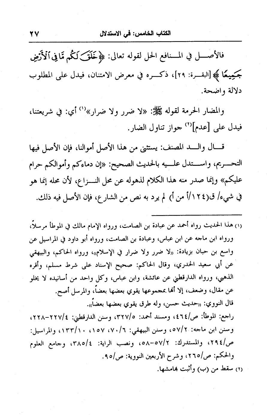 (١) هذا الحديث رواه أحمد عن عبادة بن الصات، ورواه الإمام مالك في الموطأ مرسلًا، ورواه ابن ماجه عن ابن عباس، وعبادة بن الصامت، ورواه أبو داود في المراسيل عن واسع بن حبان بزيادة: "لا ضرر ولا ضرار في الإسلام"، ورواه الحاكم، والبيهقي عن أبي سعيد الخدري، وقال الحاكم: صحيح الإسناد على شرط مسلم، وأقره الذهبي، ورواه الدارقطني عن عائشة، وابن عباس، وكل واحد من أسانيده لا يخلو عن مقال، وضعف، إلا أنها بمجموعها يقوي بعضها بعضًا، والمرسل أصح.