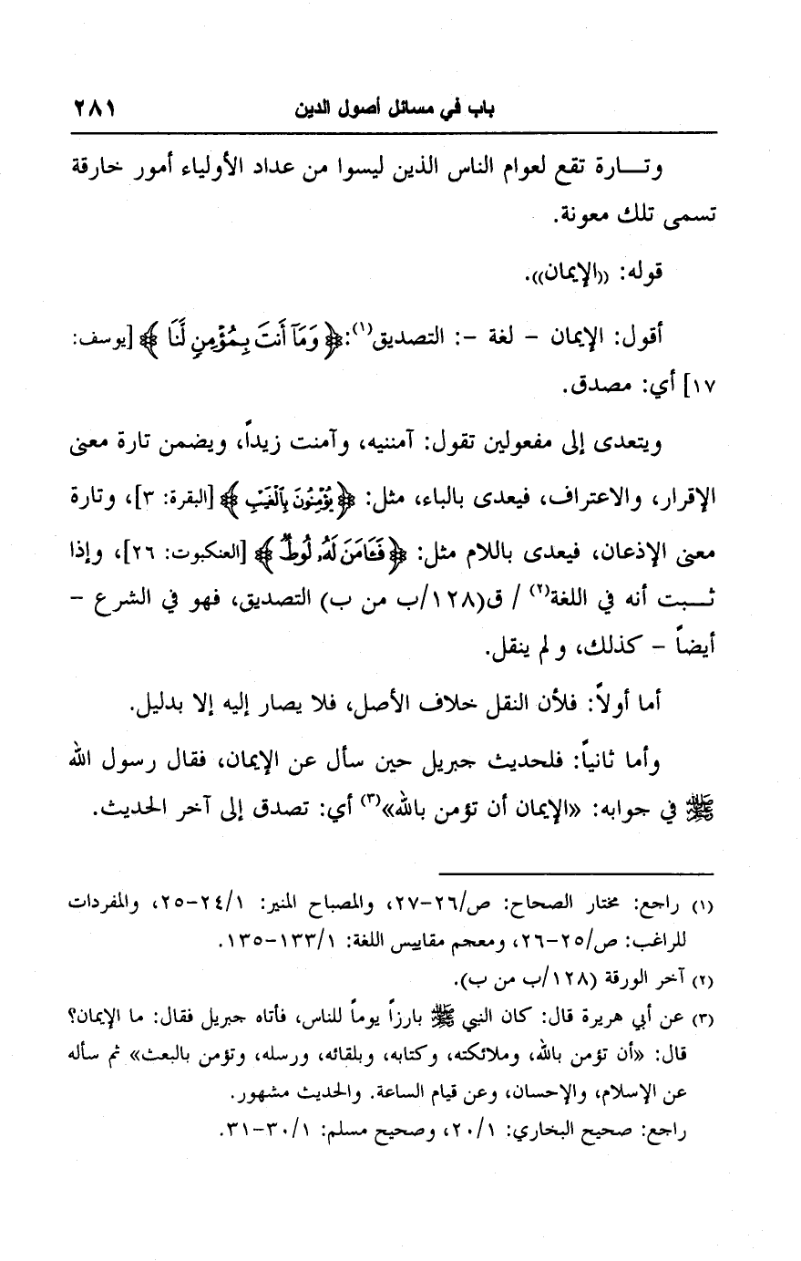 ويتعدى إلى مفعولين تقول: آمننيه، وآمنت زيدًا، ويضمن تارة معنى الإقرار، والاعتراف، فيعدى بالباء، مثل: {يُؤْمِنُونَ بِالْغَيْبِ} [البقرة: ٣]، وتارة معنى الإذعان، فيعدى باللام مثل: {فَآمَنَ لَهُ لُوطٌ} [العنكبوت: ٢٦]، وإذا ثبت أنه في اللغة (٢) التصديق، فهو في الشرع -أيضًا- كذلك، ولم ينقل.