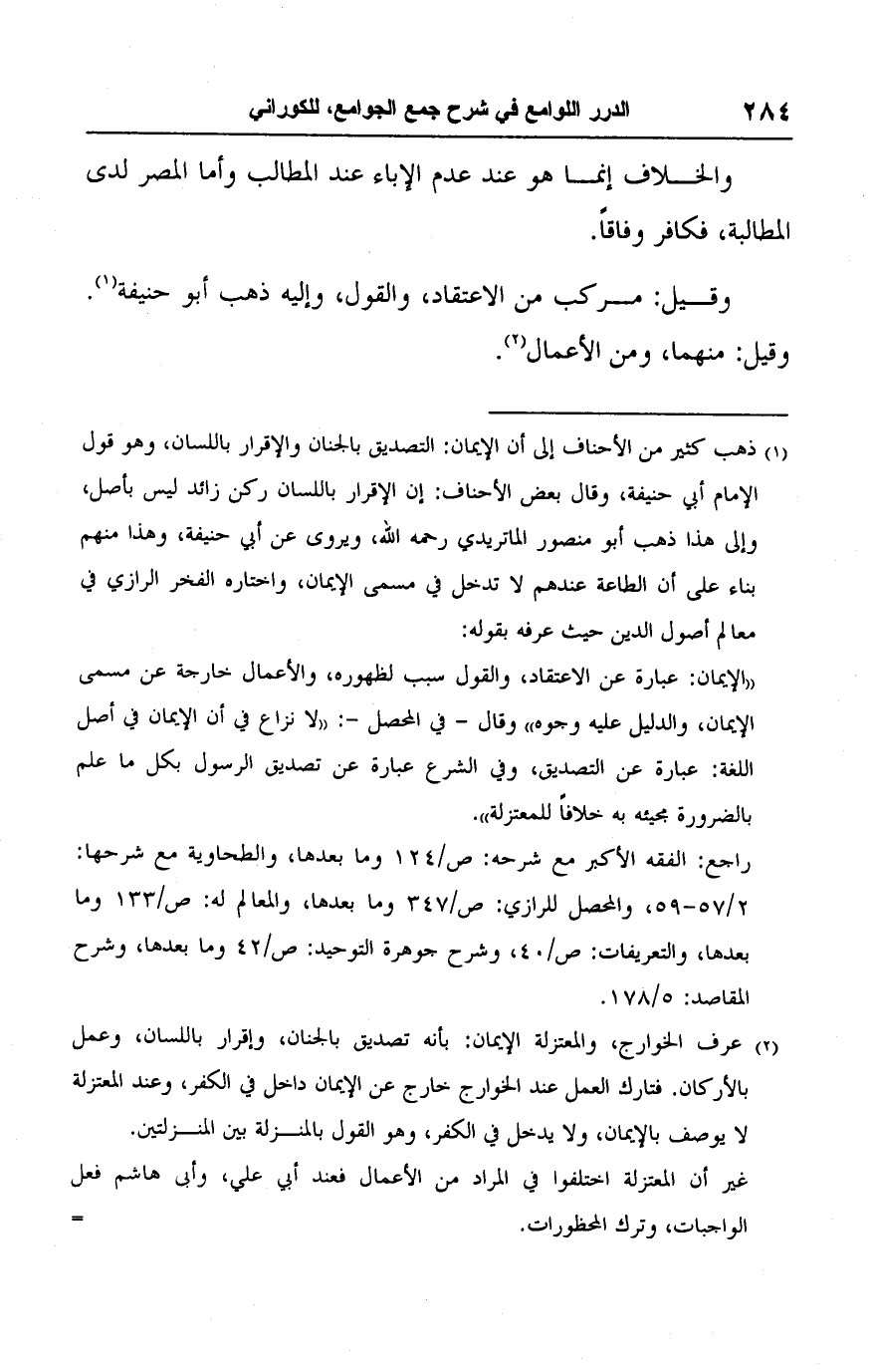 (١) ذهب كثير من الأحناف إلى أن الإيمان: التصديق بالجنان والإقرار باللسان، وهو قول الإمام أبي حنيفة، وقال بعض الأحناف: إن الإقرار باللسان ركن زائد ليس بأصل، وإلى هذا ذهب أبو منصور الماتريدي رحمه اللَّه، ويروى عن أبي حنيفة، وهذا منهم بناء على أن الطاعة عندهم لا تدخل في مسمى الإيمان، واختاره الفخر الرازي في معالم أصول الدين حيث عرفه بقوله:
