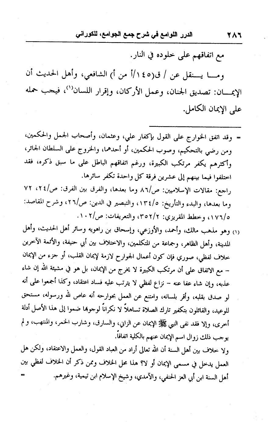 (١) وهو مذهب مالك، وأحمد، والأوزعي، وإسحاق بن راهويه وسائر أهل الحديث، وأهل المدينة، وأهل الظاهر، وجماعة من المتكلمين، والاختلاف بين أبي حنيفة، والأئمة الآخرين خلاف لفظي، صوري فإن كون أعمال الجوارح لازمة لإيمان القلب، أو جزء من الإيمان -مع الاتفاق على أن مرتكب الكبيرة لا يخرج من الإيمان، بل هو في مشيئة اللَّه إن شاء عذبه، وإن شاء عفا عنه- نزاع لفظي لا يترتب عليه فساد اعتقاد، وكذا أجمعوا على أنه لو صدق بقلبه، وأقر بلسانه، وامتنع عن العمل بحوارحه أنه عاص للَّه ورسوله، مستحق للوعيد، والقائلون بتكفير تارك الصلاة تساهلًا لا نكرانًا لوجوبها ضموا إلى هذا الأصل أدلة أخرى، وإلا فقد نفى النبي -صلى اللَّه عليه وسلم- الإيمان عن الزاني، والسارق، وشارب الخمر، والمنتهب، ولم يوجب ذلك زوال اسم الإيمان عنهم بالكلية اتفاقًا.