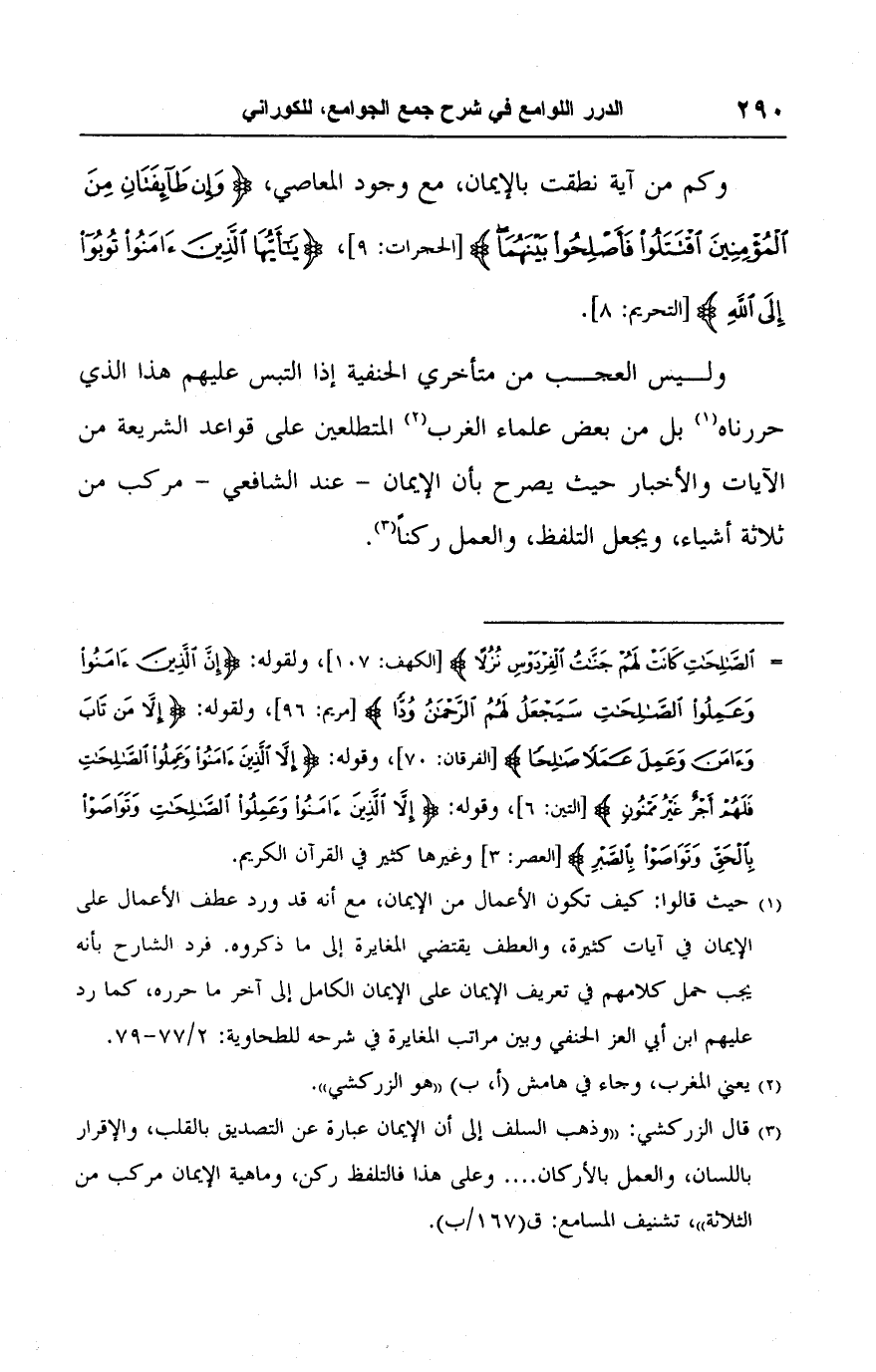 (٣) قال الزركشي: "وذهب السلف إلى أن الإيمان عبارة عن التصديق بالقلب، والإقرار باللسان، والعمل بالأركان. . . . وعلى هذا فالتلفظ ركن، وماهية الإيمان مركب من الثلاثة"، تشنيف المسامع: ق (١٦٧/ ب).