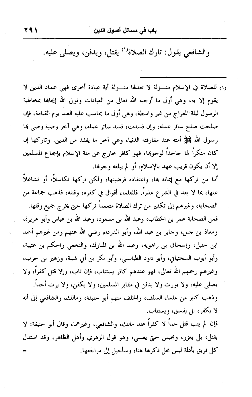 فإن لم يتب قتل حدًا لا كفرًا عند مالك، والشافعي، وغيرهما، وقال أبو حنيفة: لا يقتل، بل يعزر، ويحبس حتى يصلي، وهو قول الزهري وأهل الظاهر، وقد استدل كل فريق بأدلة ليس محل ذكرها هنا، وسأحيل إلى مراجعها. =