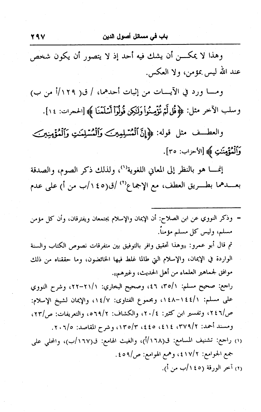 = وذكر النووي عن ابن الصلاح: أن الإيمان والإسلام يجتمعان ويفترقان، وأن كان مؤمن مسلم، وليس كل مسلم مؤمنًا.
