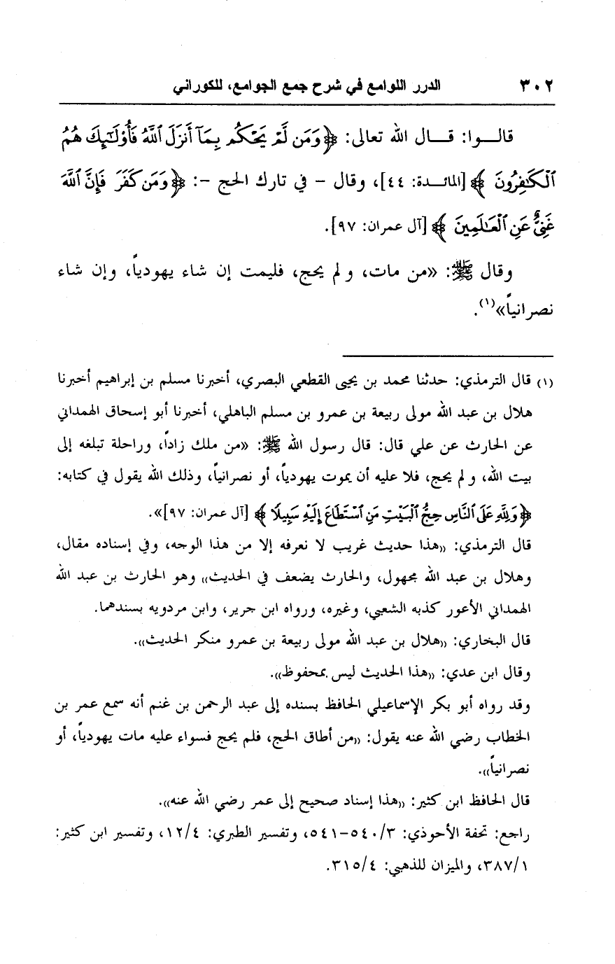 (١) قال الترمذي: حدثنا محمد بن يحيى القطعي البصري، أخبرنا مسلم بن إبراهيم أخبرنا هلال بن عبد اللَّه مولى ربيعة بن عمرو بن مسلم الباهلي، أخبرنا أبو إسحاق الهمداني عن الحارث عن علي قال: قال رسول اللَّه -صلى اللَّه عليه وسلم-: "من ملك زادًا، وراحلة تبلغه إلى بيت اللَّه، ولم يحج، فلا عليه أن يموت يهوديًا، أو نصرانيًا، وذلك اللَّه يقول في كتابه: {وَلِلَّهِ عَلَى النَّاسِ حِجُّ الْبَيْتِ مَنِ اسْتَطَاعَ إِلَيْهِ سَبِيلًا} [آل عمران: ٩٧] ".