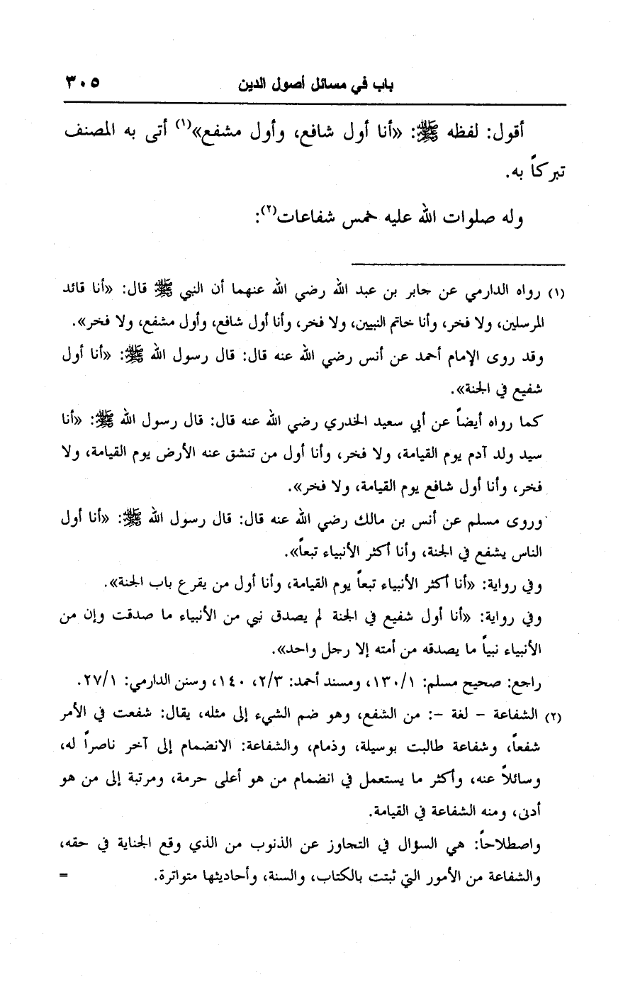 (١) رواه الدارمي عن جابر بن عبد اللَّه رضي اللَّه عنهما أن النبي -صلى اللَّه عليه وسلم- قال: "أنا قائد المرسلين، ولا فخر، وأنا خاتم النبيين، ولا فخر، وأنا أول شافع، وأول مشفع، ولا فخر". وقد روى الإمام أحمد عن أنس رضي اللَّه عنه قال: قال رسول اللَّه -صلى اللَّه عليه وسلم-: "أنا أول شفيع في الجنة".