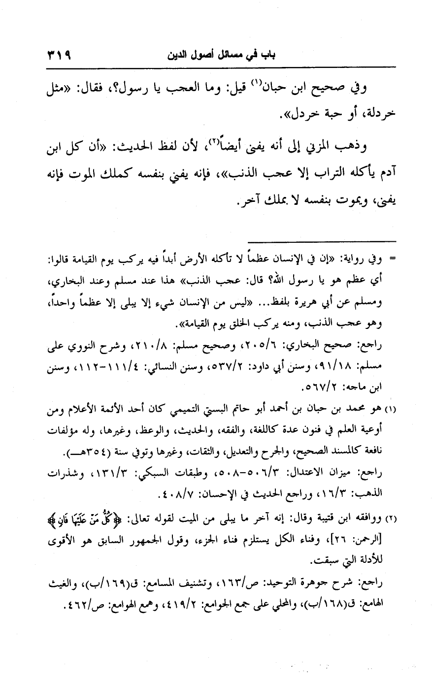(٢) ووافقه ابن قتيبة وقال: إنه آخر ما يبلى من الميت لقوله تعالى: {كُلُّ مَنْ عَلَيْهَا فَانٍ} [الرحمن: ٢٦]، وفناء الكل يستلزم فناء الجزء، وقول الجمهور السابق هو الأقوى للأدلة التي سبقت.