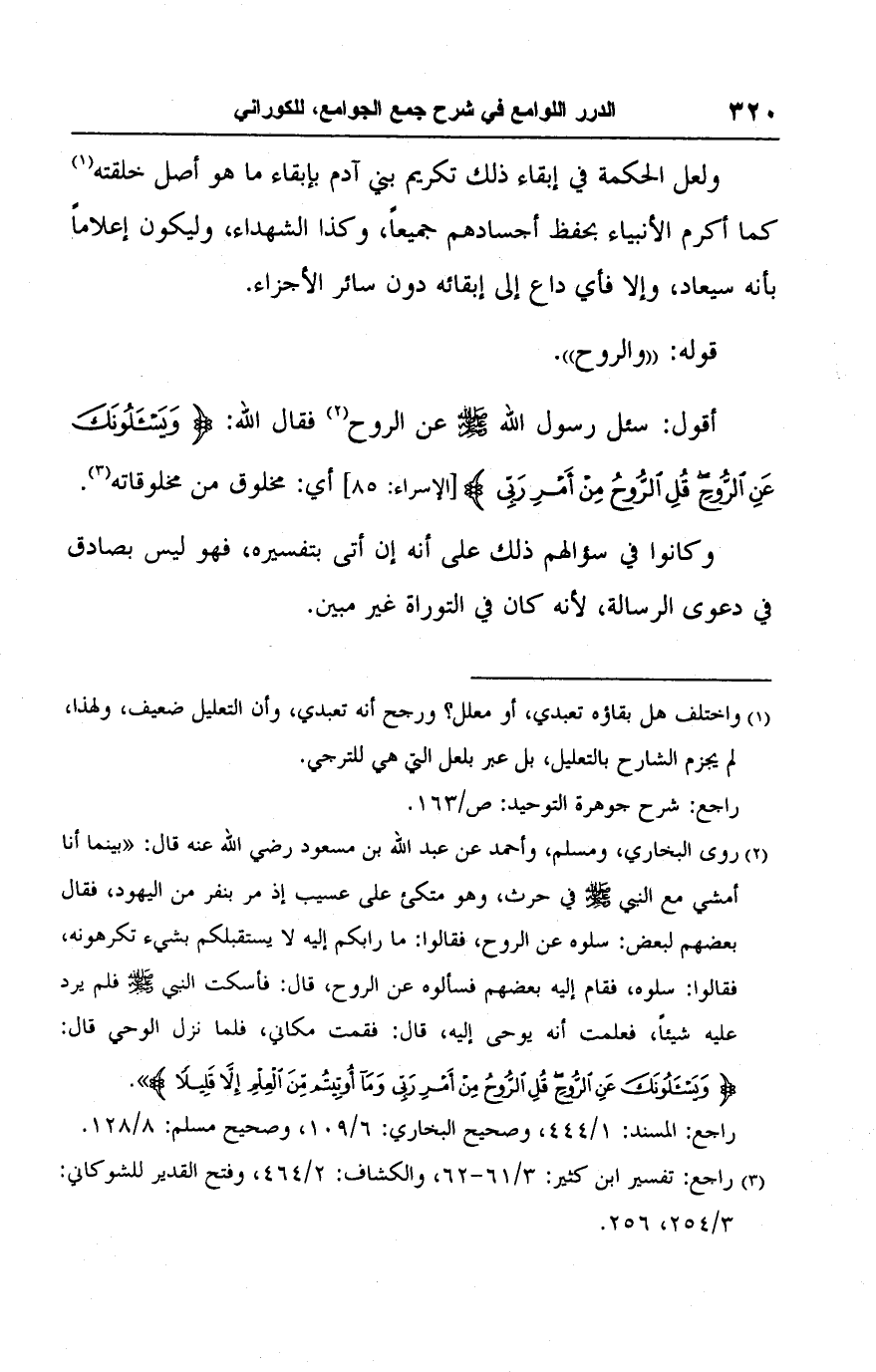 (٢) روى البخاري، ومسلم، وأحمد عن عبد اللَّه بن مسعود رضي اللَّه عنه قال: "بينما أنا أمشي مع النبي -صلى اللَّه عليه وسلم- في حرث، وهو متكئ على عسيب إذ مر بنفر من اليهود، فقال بعضهم لبعض: سلوه عن الروح، فقالوا: ما رابكم إليه لا يستقبلكم بشيء تكرهونه، فقالوا: سلوه، فقام إليه بعضهم فسألوه عن الروح، قال: فأسكت النبي -صلى اللَّه عليه وسلم- فلم يرد عليه شيئًا، فعلمت أنه يوحى إليه، قال: فقمت مكاني، فلما نزل الوحي قال: {وَيَسْأَلُونَكَ عَنِ الرُّوحِ قُلِ الرُّوحُ مِنْ أَمْرِ رَبِّي وَمَا أُوتِيتُمْ مِنَ الْعِلْمِ إِلَّا قَلِيلًا} ".