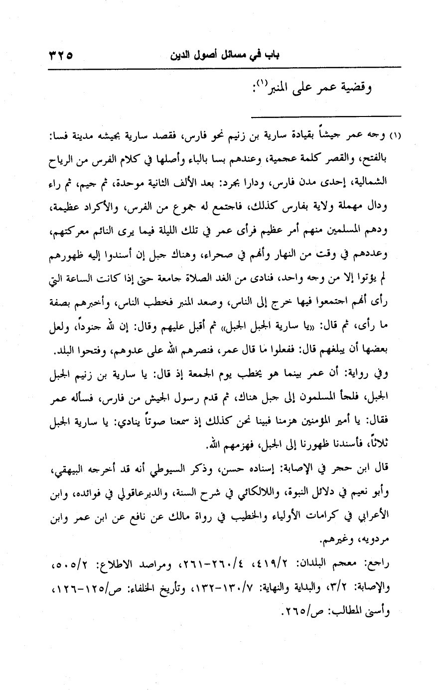(١) وجه عمر جيشًا بقيادة سارية بن زنيم نحو فارس، فقصد سارية بجيشه مدينة فسا: بالفتح، والقصر كلمة عجمية، وعندهم بسا بالباء وأصلها في كلام الفرس من الرياح الشمالية، إحدى مدن فارس، ودارا بحرد: بعد الألف الثانية موحدة، ثم جيم، ثم راء ودال مهملة ولاية بفارس كذلك، فاجتمع له جموع من الفرس، والأكراد عظيمة، ودهم المسلمين منهم أمر عطم فرأى عمر في تلك الليلة فيما يرى النائم معركتهم، وعددهم في وقت من النهار وأنهم في صحراء، وهناك جبل إن أسندوا إليه ظهورهم لم يؤتوا إلا من وجه واحد، فنادى من الغد الصلاة جامعة حتى إذا كانت الساعة التي رأى أنهم اجتمعوا فيها خرج إلى الناس، وصعد المنبر فخطب الناس، وأخبرهم بصفة ما رأى، ثم قال: "يا سارية الجبل الجبل" ثم أقبل عليهم وقال: إن للَّه جنودًا، ولعل بعضها أن يبلغهم قال: ففعلوا ما قال عمر، فنصرهم اللَّه على عدوهم، وفتحوا البلد. وفي رواية: أن عمر بينما هو يخطب يوم الجمعة إذ قال: يا سارية بن زنيم الجبل الجبل، فلجأ المسلمون إلى جبل هناك، ثم قدم رسول الجيش من فارس، فسأله عمر فقال: يا أمير المؤمنين هزمنا فبينا نحن كذلك إذ سمعنا صوتًا ينادي: يا سارية الجبل ثلاثًا، فأسندنا ظهورنا إلى الجبل، فهزمهم اللَّه.