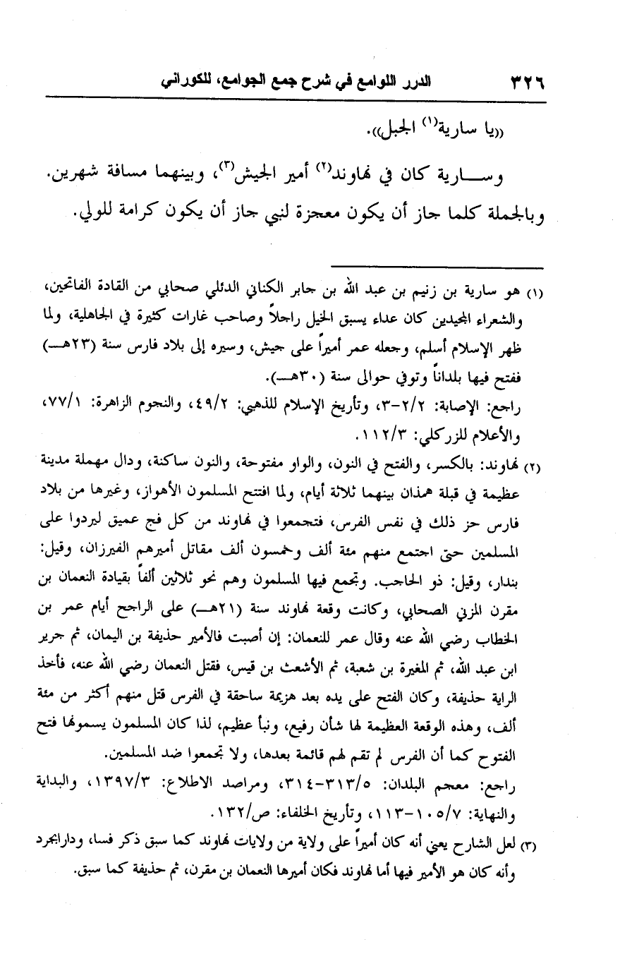 وسارية كان في نهاوند (٢) أمير الجيش (٣)، وبينهما مسافة شهرين. وبالجملة كلما جاز أن يكون معجزة لنبي جاز أن يكون كرامة للولي.
