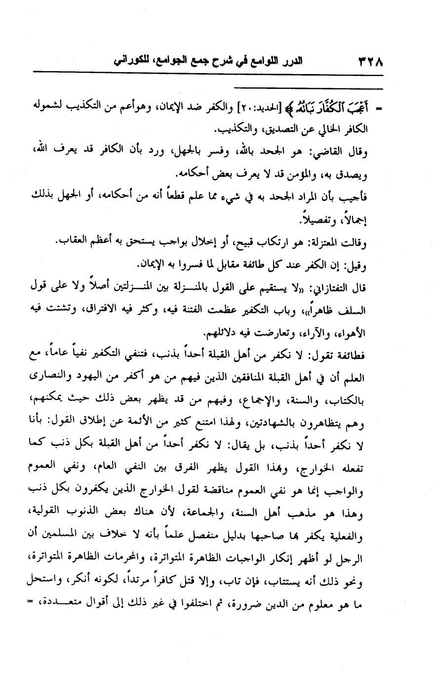 قال التفتازاني: "لا يستقيم على القول بالمنزلة بين المنزلتين أصلًا ولا على قول السلف ظاهرًا"، وباب التكفير عظمت الفتنة فيه، وكثر فيه الافتراق، وتشتت فيه الأهواء، والآراء، وتعارضت فيه دلائلهم.