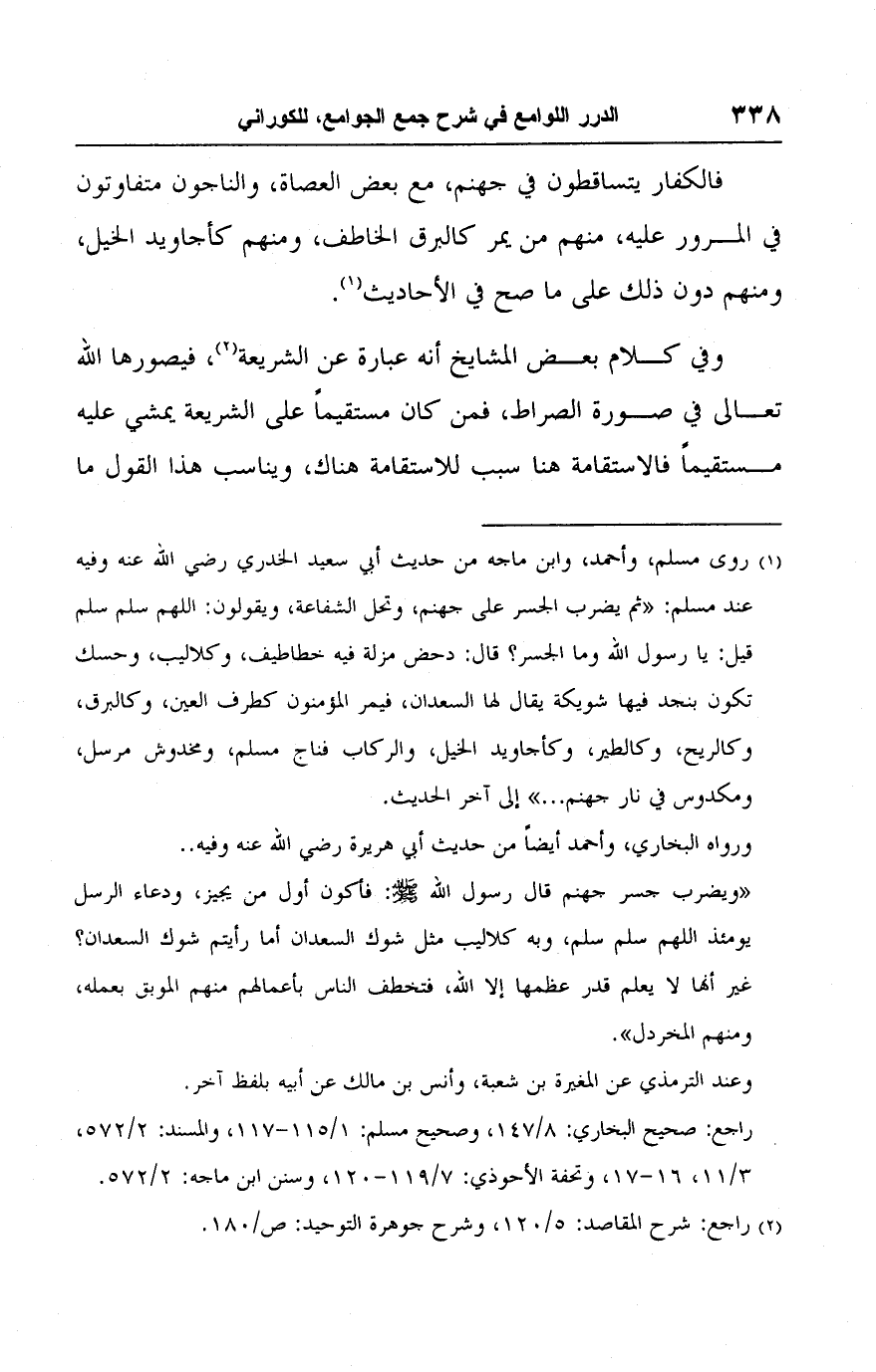 (١) روى مسلم، وأحمد، وابن ماجه من حديث أبي سعيد الخدري رضي اللَّه عنه وفيه عند مسلم: "ثم يضرب الجسر على جهنم، وتحل الشفاعة، ويقولون: اللهم سلم سلم قيل: يا رسول اللَّه وما الجسر؟ قال: دحض مزلة فيه خطاطيف، وكلاليب، وحسك تكون بنجد فيها شويكة يقال لها السعدان، فيمر المؤمنون كطرف العين، وكالبرق، وكالريح، وكالطير، وكأجاويد الخيل، والركاب فناج مسلم، ومخدوش مرسل، ومكدوس في نار جهنم. . . " إلى آخر الحديث.