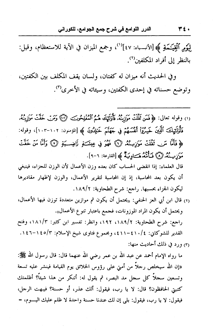 (١) وقوله تعالى: {فَمَنْ ثَقُلَتْ مَوَازِينُهُ فَأُولَئِكَ هُمُ الْمُفْلِحُونَ (١٠٢) وَمَنْ خَفَّتْ مَوَازِينُهُ فَأُولَئِكَ الَّذِينَ خَسِرُوا أَنْفُسَهُمْ فِي جَهَنَّمَ خَالِدُونَ} [المؤمنون: ١٠٢ - ١٠٣]، وقوله: {فَأَمَّا مَنْ ثَقُلَتْ مَوَازِينُهُ (٦) فَهُوَ فِي عِيشَةٍ رَاضِيَةٍ (٧) وَأَمَّا مَنْ خَفَّتْ مَوَازِينُهُ (٨) فَأُمُّهُ هَاوِيَةٌ} [القارعة: ٦ - ٩].