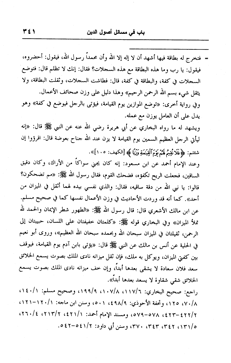 وعند الإمام أحمد عن ابن مسعود: إنه كان يجنى سواكًا من الأراك، وكان دقيق الساقين، فجعلت الريح تكفؤه، فضحك القوم، فقال رسول اللَّه -صلى اللَّه عليه وسلم-: "مم تضحكون؟ قالوا: يا نبي اللَّه من دقة ساقيه، فقال: والذي نفسي بيده لهما أثقل في الميزان من أحد". كما أنه قد وردت الأحاديث في وزن الأعمال نفسها كما في صحيح مسلم. عن ابن مالك الأشعري قال: قال رسول اللَّه -صلى اللَّه عليه وسلم-: "الطهور شطر الإيمان والحمد للَّه تملأ الميزان" وفي البخاري قوله -صلى اللَّه عليه وسلم-: "كلمتان خفيفتان على اللسان، حبيبتان إلى الرحمن، ثقيلتان في الميزان سبحان اللَّه وبحمده سبحان اللَّه العظيم"، وروى أبو نعيم في الحلية عن أنس بن مالك عن النبي -صلى اللَّه عليه وسلم- قال: "يؤتى بابن آدم يوم القيامة، فيوقف بين كفتي الميزان، ويوكل به ملك، فإن ثقل ميزانه نادى الملك بصوت يسمع الخلائق سعد فلان سعادة لا يشقى بعدها أبدًا، وإن خف ميزانه نادى الملك بصوت يسمع الخلائق شقي شقاوة لا يسعد بعدها أبدًا".
