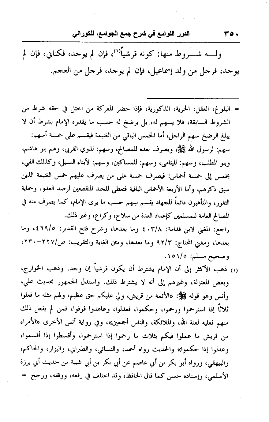 (١) ذهب الأكثر إلى أن الإمام يشترط أن يكون قرشيًا إن وجد. وذهب الخوارج، وبعض المعتزلة، وغيرهم إلى أنه لا يشترط ذلك. واستدل الجمهور بحديث علي، وأنس وهو قوله -صلى اللَّه عليه وسلم-: "الأئمة من قريش، ولي عليكم حق عظيم، ولهم مثله ما فعلوا ثلاثًا إذا استرحموا ورحموا، وحكموا، فعدلوا، وعاهدوا فوفوا، فمن لم يفعل ذلك منهم فعليه لعنة اللَّه، والملائكة، والناس أجمعين"، وفي رواية أنس الأخرى "الأمراء من قريش ما عملوا فيكم بثلاث ما رحموا إذا استرحموا، وأقسطوا إذا أقسموا، وعدلوا إذا حكموا" والحديث رواه أحمد، والنسائي، والطبراني، والبزار، والحاكم، والبيهقي، ورواه أبو بكر بن أبي عاصم عن أبي بكر بن أبي شيبة من حديث أبي برزة الأسلمي، وإسناده حسن كما قال الحافظ، وقد اختلف في رفعه، ووقفه، ورجح =