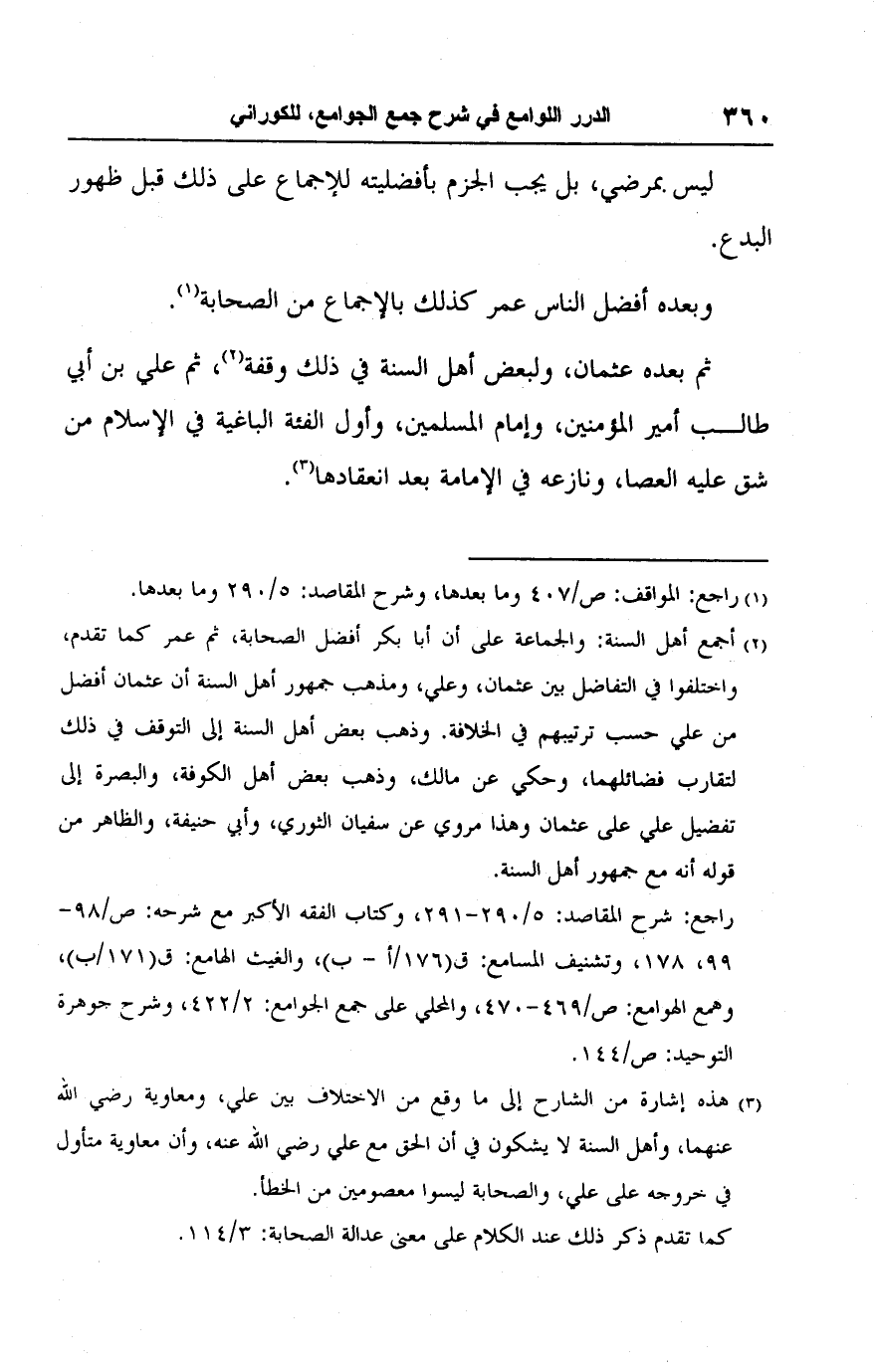 (٢) أجمع أهل السنة: والجماعة على أن أبا بكر أفضل الصحابة، ثم عمر كما تقدم، واختلفوا في التفاضل بين عثمان، وعلي، ومذهب جمهور أهل السنة أن عثمان أفضل من علي حسب ترتيبهم في الخلافة. وذهب بعض أهل السنة إلى التوقف في ذلك لتقارب فضائلهما، وحكي عن مالك، وذهب بعض أهل الكوفة، والبصرة إلى تفضيل علي على عثمان وهذا مروى عن سفيان الثوري، وأبي حنيفة، والظاهر من قوله أنه مع جمهور أهل السنة.