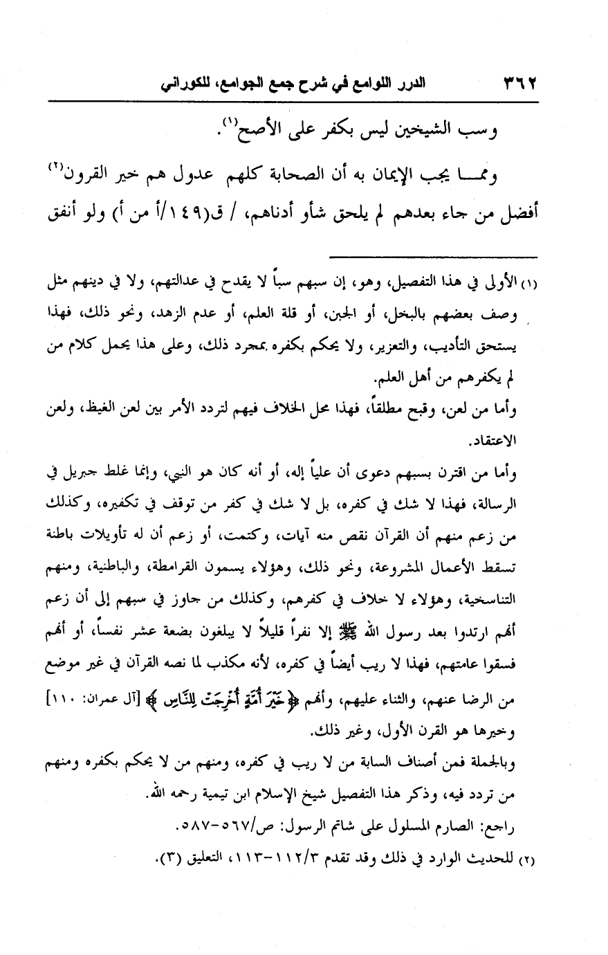 (١) الأولى في هذا التفصيل، وهو، إن سبهم سبًا لا يقدح في عدالتهم، ولا في دينهم مثل وصف بعضهم بالبخل، أو الجبن، أو قلة العلم، أو عدم الزهد، ونحو ذلك، فهذا يستحق التأديب، والتعزير، ولا يحكم بكفره بمجرد ذلك، وعلى هذا يحمل كلام من لم يكفرهم من أهل العلم.