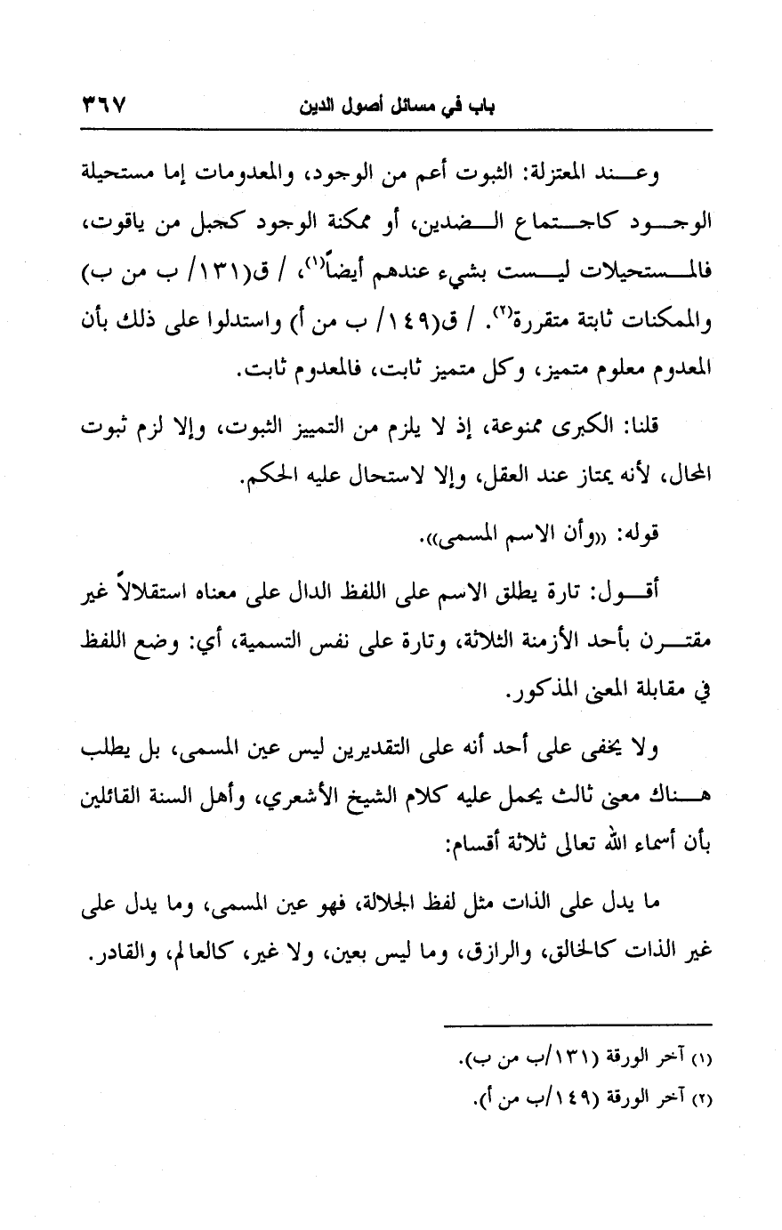 وعند المعتزلة: الثبوت أعم من الوجود، والمعدومات إما مستحيلة الوجود كاجتماع الضدين، أو ممكنة الوجود كجبل من ياقوت، فالمستحيلات ليست بشيء عندهم أيضًا (١)، والممكنات ثابتة متقررة (٢). واستدلوا على ذلك بأن المعدوم معلوم متميز، وكل متميز ثابت، فالمعدوم ثابت.