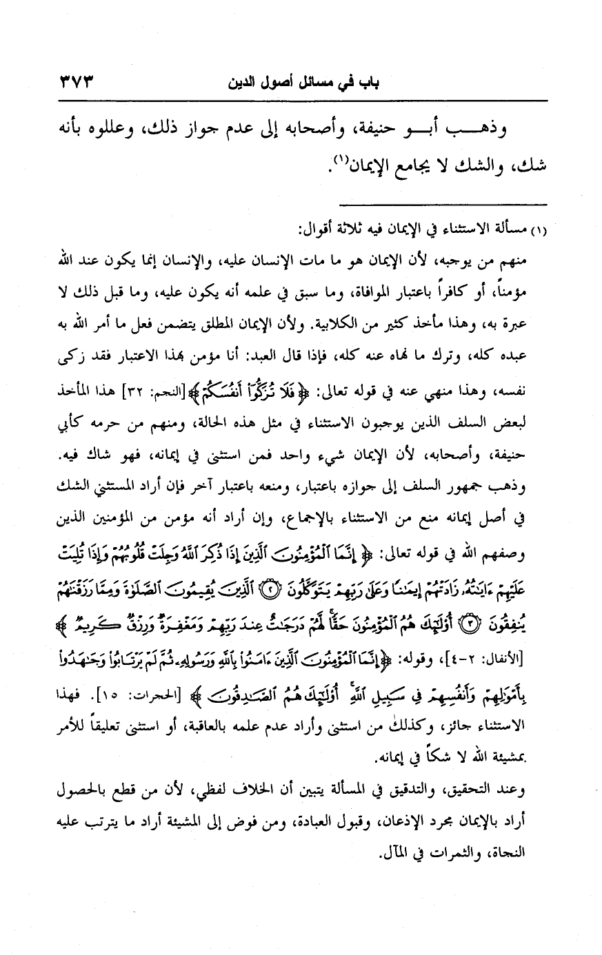 منهم من يوجبه، لأن الإيمان هو ما مات الإنسان عليه، والإنسان إنما يكون عند اللَّه مؤمنًا، أو كافرًا باعتبار الموافاة، وما سبق في علمه أنه يكون عليه، وما قبل ذلك لا عبرة به، وهذا مأخذ كثير من الكلابية. ولأن الإيمان المطلق يتضمن فعل ما أمر اللَّه به عبده كله، وترك ما نهاه عنه كله، فإذا قال العبد: أنا مؤمن بهذا الاعتبار فقد زكى نفسه، وهذا منهي عنه في قوله تعالى: {فَلَا تُزَكُّوا أَنْفُسَكُمْ} [النجم: ٣٢] هذا المأخذ لبعض السلف الذين يوجبون الاستثناء في مثل هذه الحالة، ومنهم من حرمه كأبي حنيفة، وأصحابه، لأن الإيمان شيء واحد فمن استثنى في إيمانه، فهو شاك فيه. وذهب جمهور السلف إلى جوازه باعتبار، ومنعه باعتبار آخر فإن أراد المستثني الشك في أصل إيمانه منع من الاستثناء بالإجماع، وإن أراد أنه مؤمن من المؤمنين الذين وصفهم اللَّه في قوله تعالى: {إِنَّمَا الْمُؤْمِنُونَ الَّذِينَ إِذَا ذُكِرَ اللَّهُ وَجِلَتْ قُلُوبُهُمْ وَإِذَا تُلِيَتْ عَلَيْهِمْ آيَاتُهُ زَادَتْهُمْ إِيمَانًا وَعَلَى رَبِّهِمْ يَتَوَكَّلُونَ (٢) الَّذِينَ يُقِيمُونَ الصَّلَاةَ وَمِمَّا رَزَقْنَاهُمْ يُنْفِقُونَ (٣) أُولَئِكَ هُمُ الْمُؤْمِنُونَ حَقًّا لَهُمْ دَرَجَاتٌ عِنْدَ رَبِّهِمْ وَمَغْفِرَةٌ وَرِزْقٌ كَرِيمٌ} [الأنفال: ٢ - ٤]، وقوله: {إِنَّمَا الْمُؤْمِنُونَ الَّذِينَ آمَنُوا بِاللَّهِ وَرَسُولِهِ ثُمَّ لَمْ يَرْتَابُوا وَجَاهَدُوا بِأَمْوَالِهِمْ وَأَنْفُسِهِمْ فِي سَبِيلِ اللَّهِ أُولَئِكَ هُمُ الصَّادِقُونَ} [الحجرات: ١٥]. فهذا الاستثناء جائز، وكذلك من استثنى وأراد عدم علمه بالعاقبة، أو استثنى تعليقًا للأمر بمشيئة اللَّه لا شكًا في إيمانه.