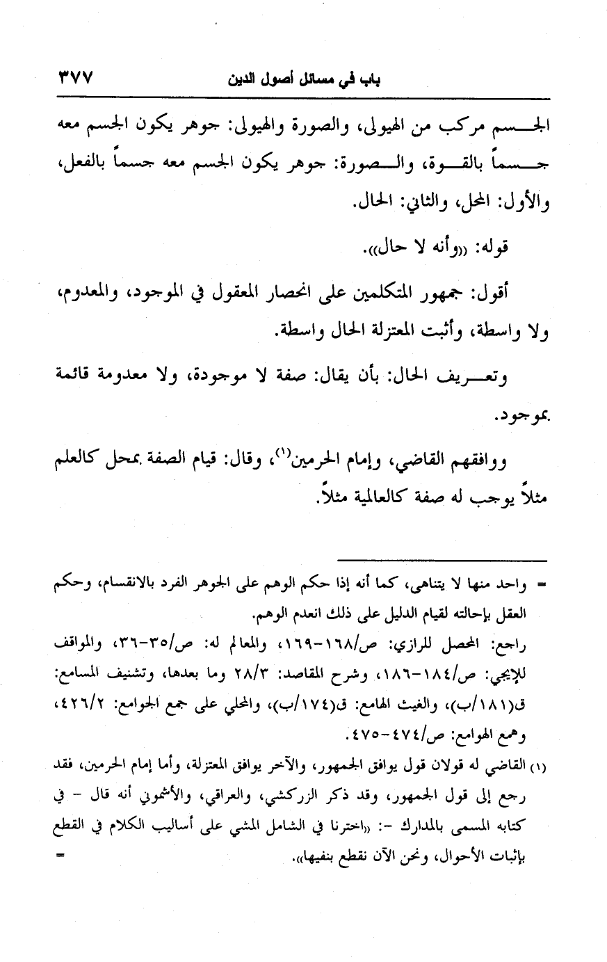 أقول: جمهور المتكلمين على انحصار المعقول في الموجود، والمعدوم، ولا واسطة، وأثبت المعتزلة الحال واسطة.