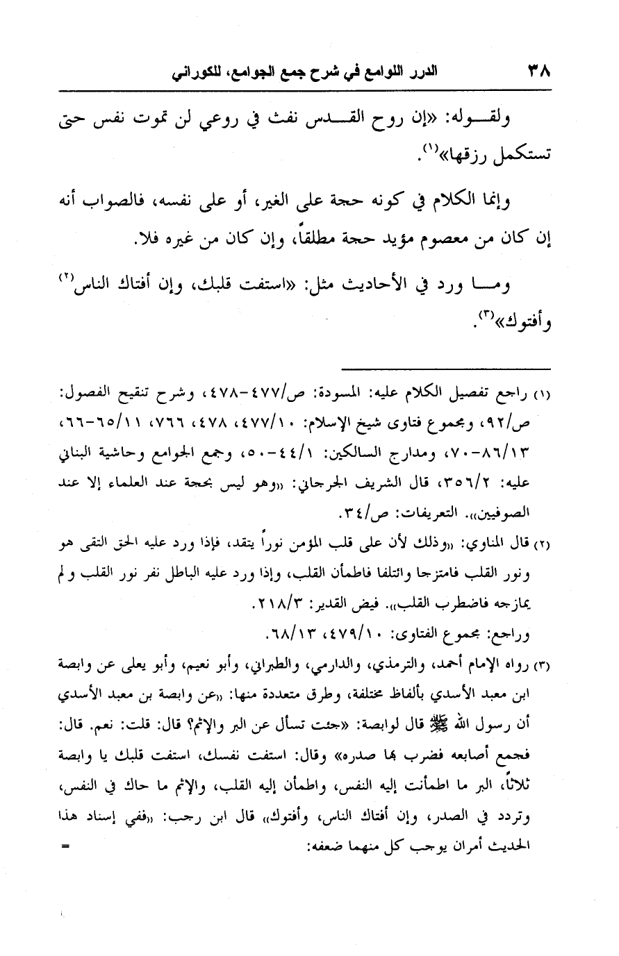 (٣) رواه الإمام أحمد، والترمذي، والدارمي، والطبراني، وأبو نعيم، وأبو يعلى عن وابصة ابن معبد الأسدي بألفاظ مختلفة، وطرق متعددة منها: "عن وابصة بن معبد الأسدي أن رسول اللَّه -صلى اللَّه عليه وسلم- قال لوابصة: "جئت تسأل عن البر والإثم؟ قال: قلت: نعم. قال: فجمع أصابعه فضرب بها صدره" وقال: استفت نفسك، استفت قلبك يا وابصة ثلاثًا، البر ما اطمأنت إليه النفس، واطمأن إليه القلب، والإثم ما حاك في النفس، وتردد في الصدر، وإن أفتاك الناس، وأفتوك" قال ابن رجب: "ففي إسناد هذا الحديث أمران يوجب كل منهما ضعفه: =