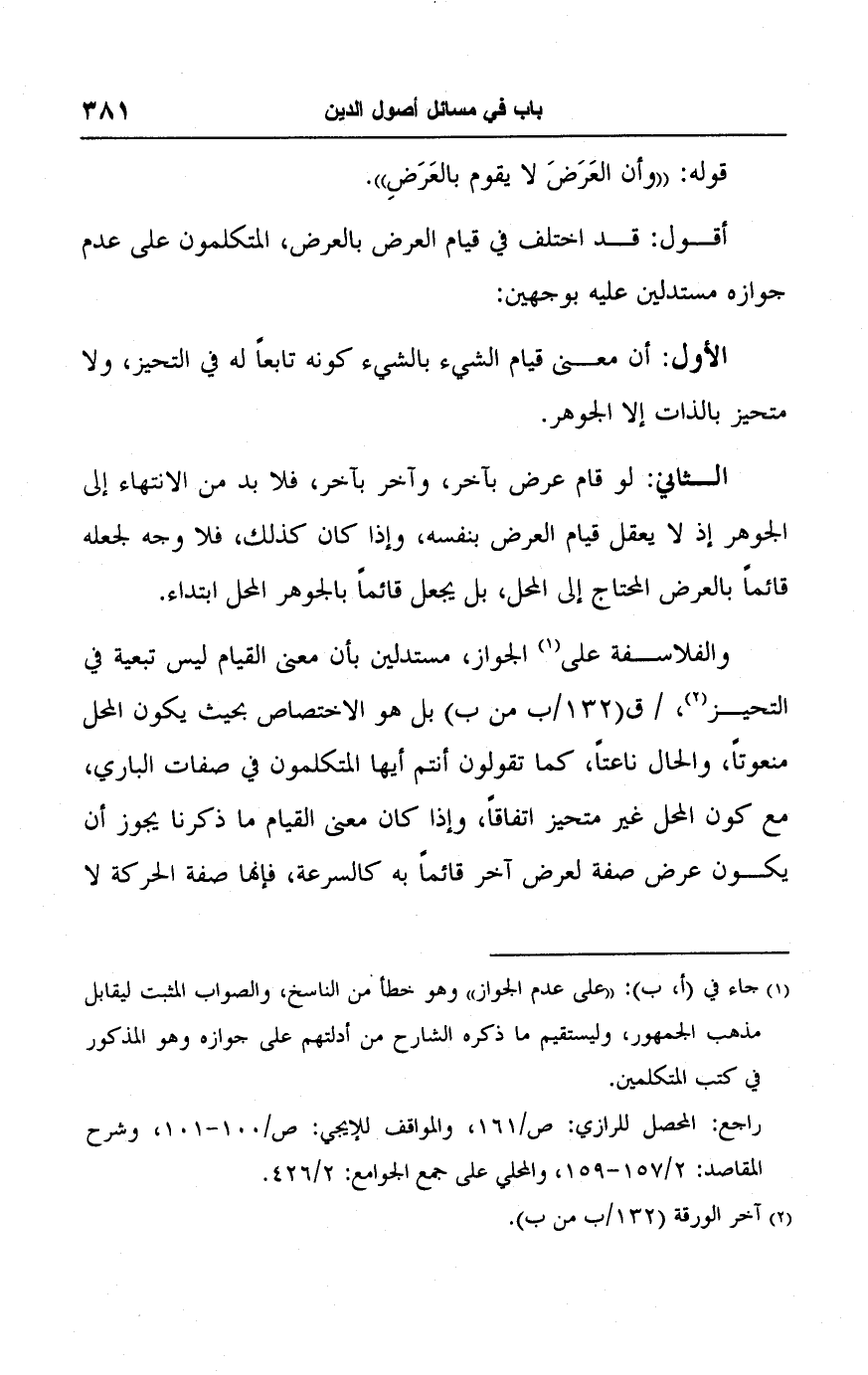أقول: قد اختلف في قيام العرض بالعرض، المتكلمون على عدم جوازه مستدلين عليه بوجهين: