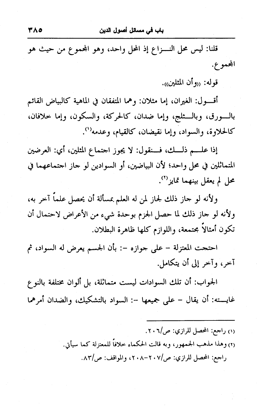 راجع: المحصل للرازي: ص/ ٢٠٧ - ٢٠٨، والمواقف: ص/ ٨٣.