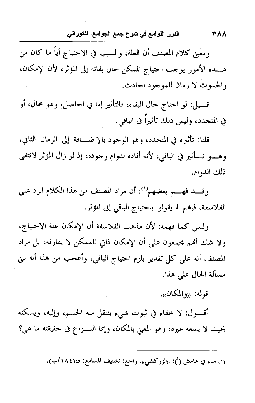 ومعنى كلام المصنف أن العلة، والسبب في الاحتياج أيًا ما كان من هذه الأمور يوجب احتياج الممكن حال بقائه إلى المؤثر، لأن الإمكان، والحدوث لا زمان للموجود الحادث.
