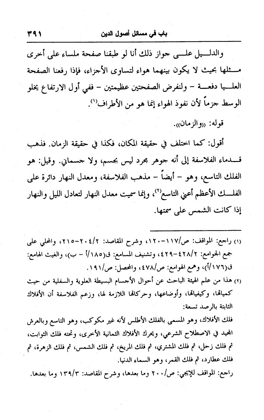 أقول: كما اختلف في حقيقة المكان، فكذا في حقيقة الزمان. فذهب قدماء الفلاسفة إلى أنه جوهر مجرد ليس بجسم، ولا جسماني. وقيل: هو الفلك التاسع، وهو -أيضًا- مذهب الفلاسفة، ومعدل النهار دائرة على الفلك الأعظم أعني التاسع (٢)، وإنما سميت معدل النهار لتعادل الليل والنهار إذا كانت الشمس على سمتها.
