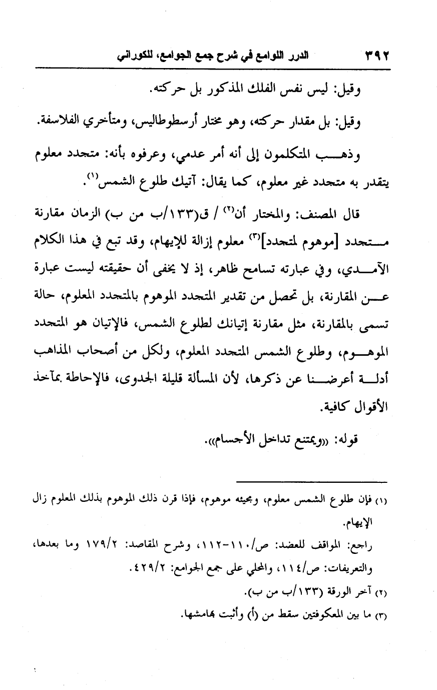 قال المصنف: والمختار أن (٢) الزمان مقارنة متجدد [موهوم لمتجدد] (٣) معلوم إزالة للإيهام، وقد تبع في هذا الكلام الآمدي، وفي عبارته تسامح ظاهر، إذ لا يخفى أن حقيقته ليست عبارة عن المقارنة، بل تحصل من تقدير المتجدد الموهوم بالمتجدد المعلوم، حالة تسمى بالمقارنة، مثل مقارنة إتيانك لطلوع الشمس، فالإتيان هو المتجدد الموهوم، وطلوع الشمس المتجدد المعلوم، ولكل من أصحاب المذاهب أدلة أعرضنا عن ذكرها، لأن المسألة قليلة الجدوى، فالإحاطة بمآخذ الأقوال كافية.