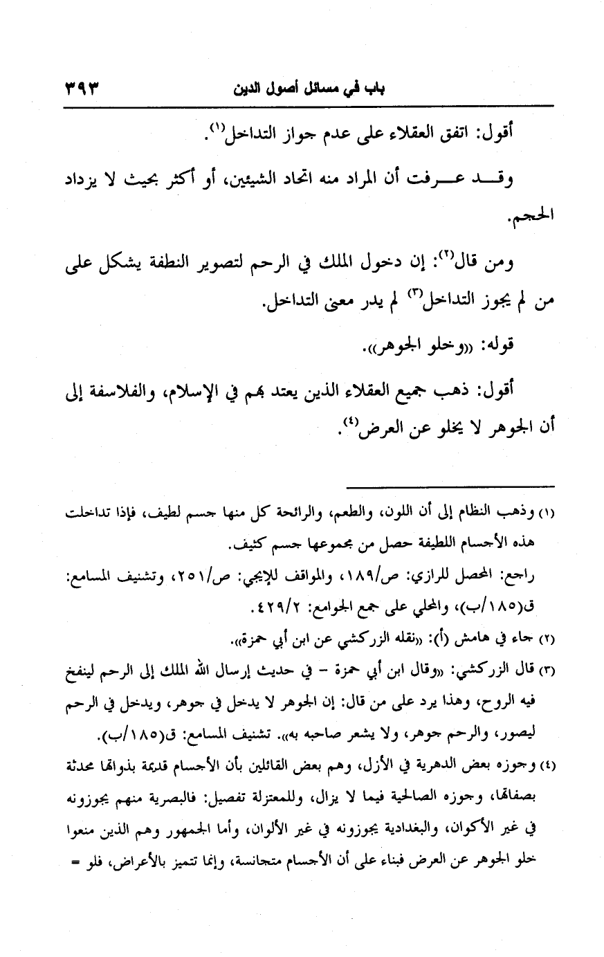 (٣) قال الزركشي: "وقال ابن أبي حمزة - في حديث إرسال اللَّه الملك إلى الرحم لينفخ فيه الروح، وهذا يرد على من قال: إن الجوهر لا يدخل في جوهر، ويدخل في الرحم ليصور، والرحم جوهر، ولا يشعر صاحبه به". تشنيف المسامع: ق (١٨٥/ ب).