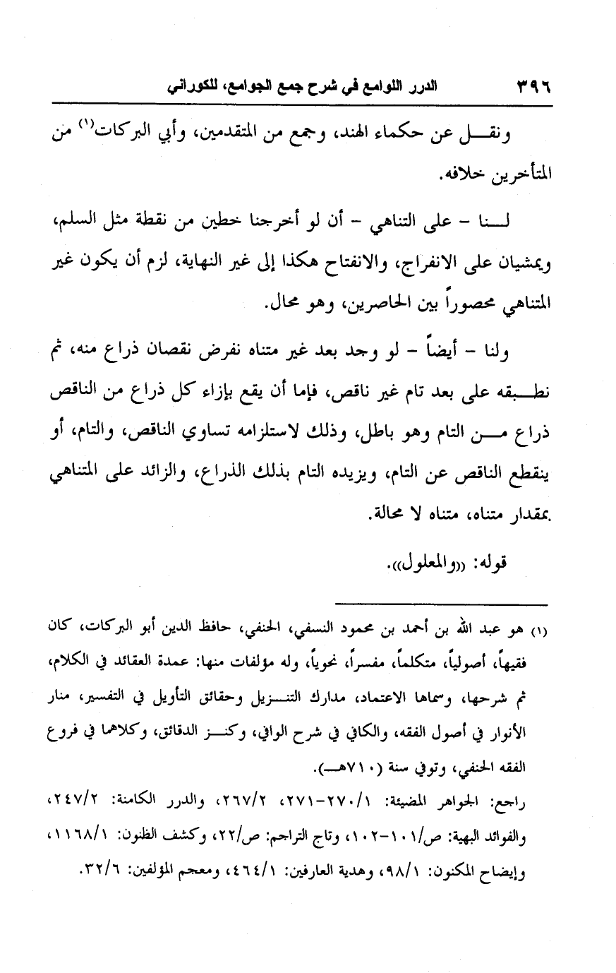 (١) هو عبد اللَّه بن أحمد بن محمود النسفي، الحنفي، حافظ الدين أبو البركات، كان فقيهًا، أصوليًا، متكلمًا، مفسرًا، نحويًا، وله مؤلفات منها: عمدة العقائد في الكلام، ثم شرحها، وسماها الاعتماد، مدارك التنزيل وحقائق التأويل في التفسير، منار الأنوار في أصول الفقه، والكافي في شرح الوافي، وكنز الدقائق، وكلاهما في فروع الفقه الحنفي، وتوفي سنة (٧١٠ هـ).