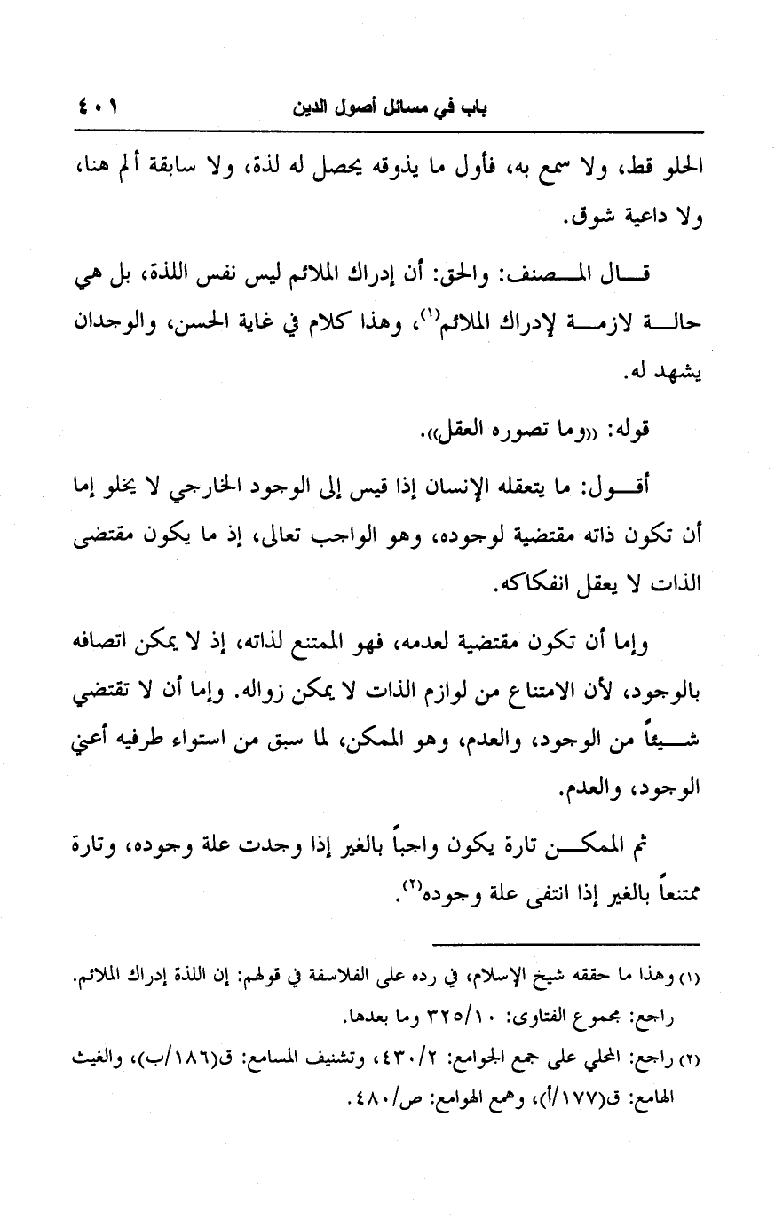 (١) وهذا ما حققه شيخ الإسلام، في رده على الفلاسفة في قولهم: إن اللذة إدراك الملائم. راجع: مجموع الفتاوى: ١٠/ ٣٢٥ وما بعدها.