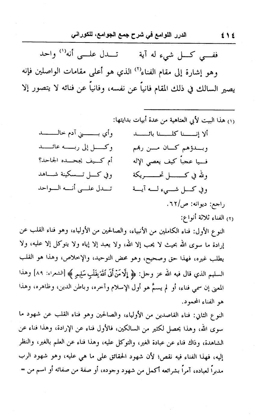 وهو إشارة إلى مقام الفناء (٢) الذي هو أعلى مقامات الواصلين فإنه يصير السالك في ذلك المقام فانيًا عن نفسه، وفانيًا عن فنائه لا يتصور إلا