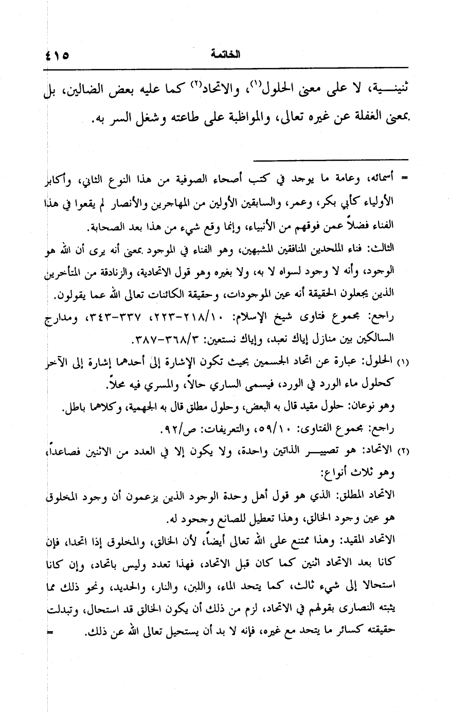 = أسمائه، وعامة ما يوجد في كتب أصحاء الصوفية من هذا النوع الثاني، وأكابر الأولياء كأبي بكر، وعمر، والسابقين الأولين من المهاجرين والأنصار لم يقعوا في هذا الفناء فضلًا عمن فوتهم من الأنبياء، وإنما وقع شيء من هذا بعد الصحابة.