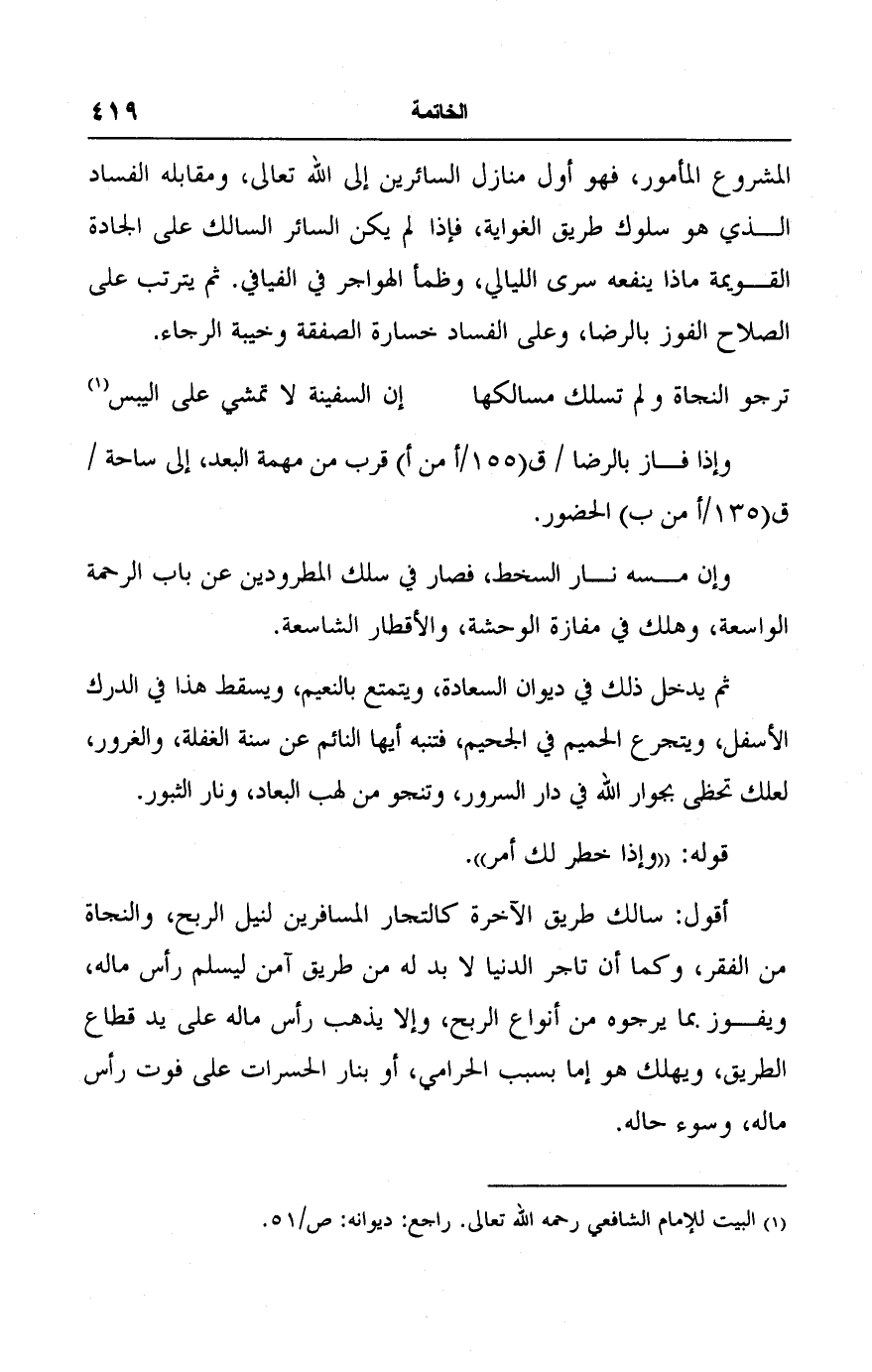 أقول: سالك طريق الآخرة كالتجار المسافرين لنيل الربح، والنجاة من الفقر، وكما أن تاجر الدنيا لا بد له من طريق آمن ليسلم رأس ماله، ويفوز بما يرجوه من أنواع الربح، وإلا يذهب رأس ماله على يد قطاع الطريق، ويهلك هو إما بسبب الحرامي، أو بنار الحسرات على فوت رأس ماله، وسوء حاله.