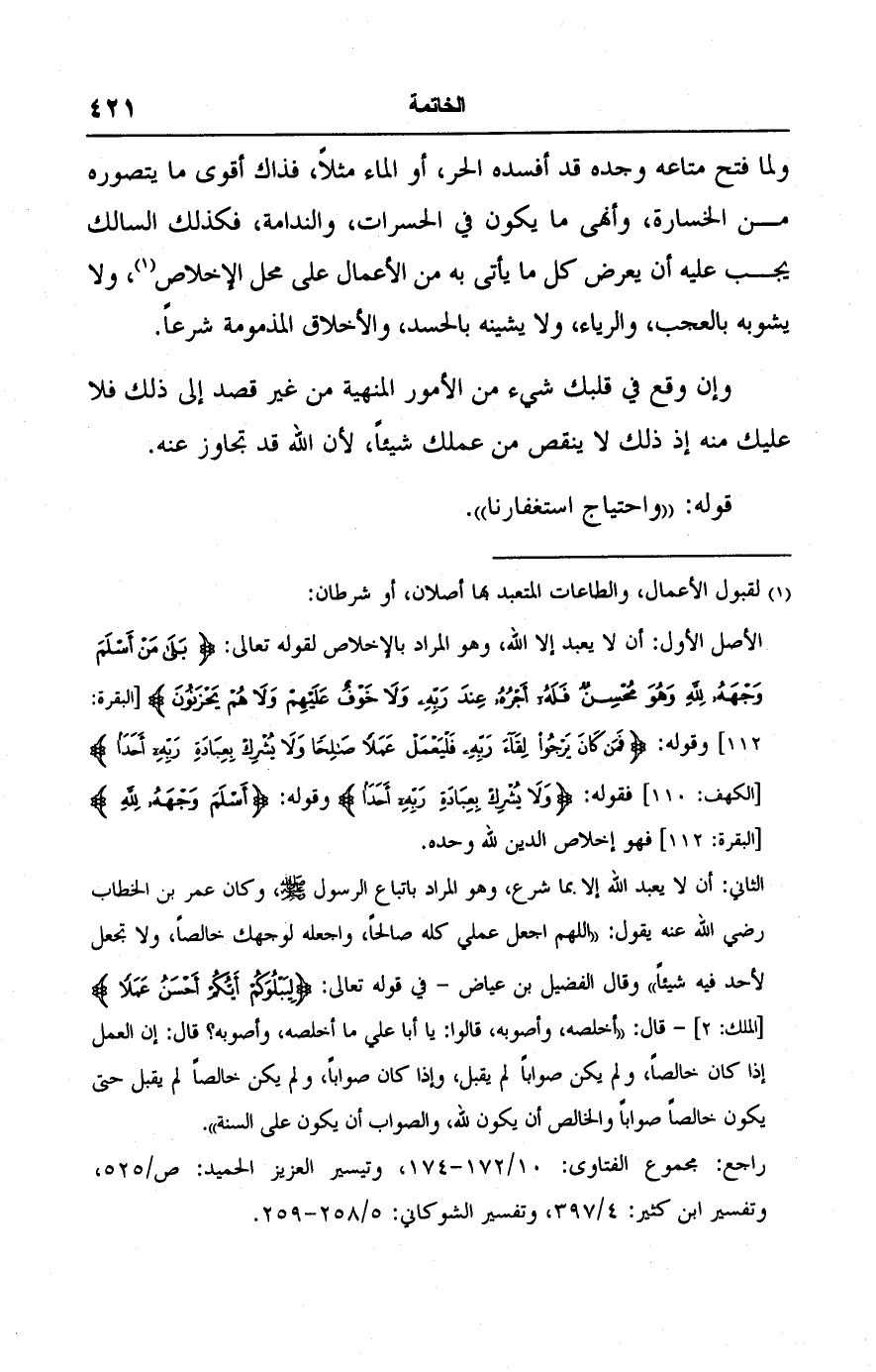 الأصل الأول: أن لا يعبد إلا اللَّه، وهو المراد بالإخلاص لقوله تعالى: {بَلَى مَنْ أَسْلَمَ وَجْهَهُ لِلَّهِ وَهُوَ مُحْسِنٌ فَلَهُ أَجْرُهُ عِنْدَ رَبِّهِ وَلَا خَوْفٌ عَلَيْهِمْ وَلَا هُمْ يَحْزَنُونَ} [البقرة: ١١٢] وقوله: {فَمَنْ كَانَ يَرْجُو لِقَاءَ رَبِّهِ فَلْيَعْمَلْ عَمَلًا صَالِحًا وَلَا يُشْرِكْ بِعِبَادَةِ رَبِّهِ أَحَدًا} [الكهف: ١١٠] فقوله: {وَلَا يُشْرِكْ بِعِبَادَةِ رَبِّهِ أَحَدًا} وقوله: {أَسْلَمَ وَجْهَهُ لِلَّهِ} [البقرة: ١١٢] فهو إخلاص الدين للَّه وحده.