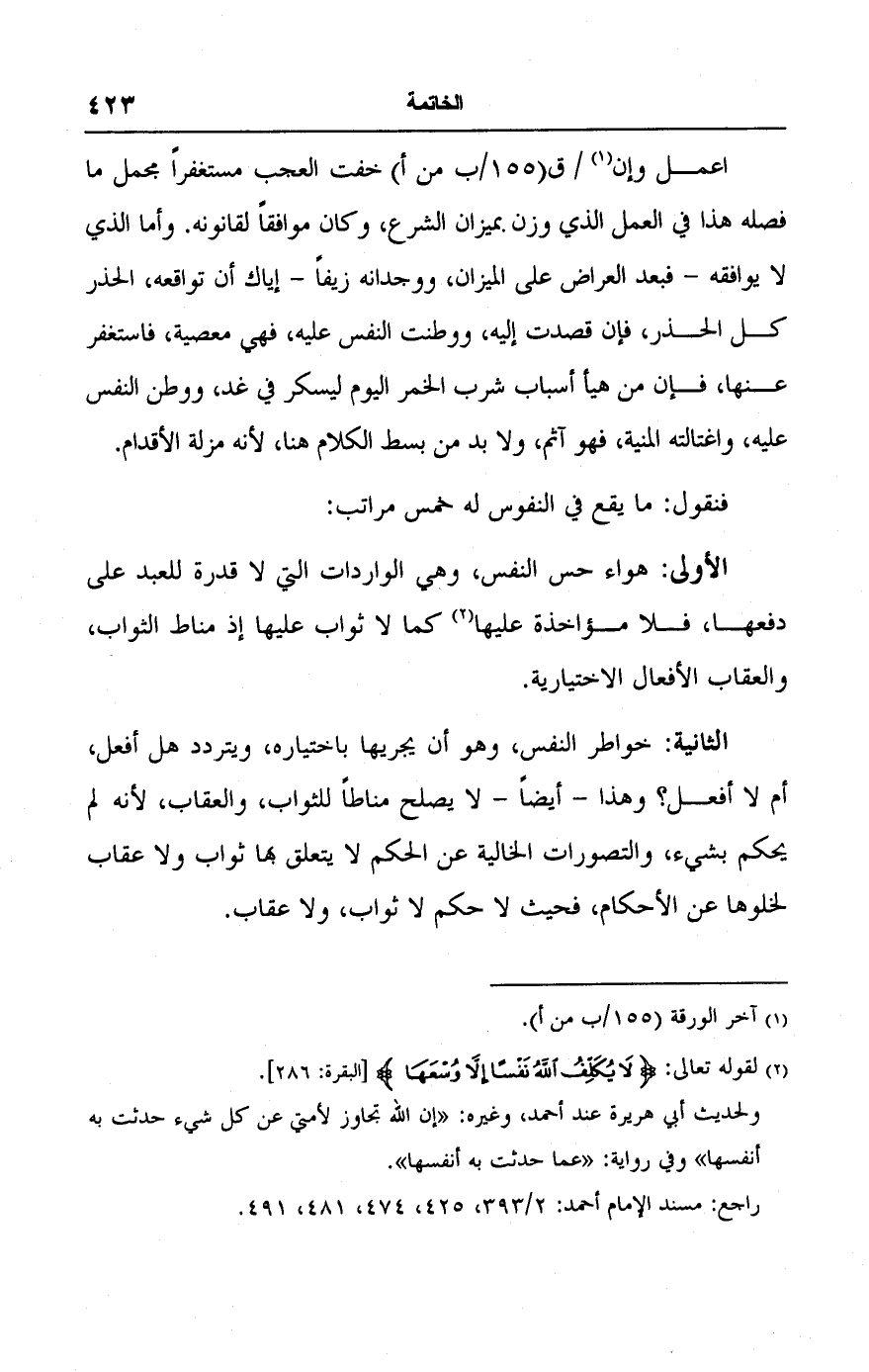 الثانية: خواطر النفس، وهو أن يجريها باختياره، ويتردد هل أفعل، أم لا أفعل؟ وهذا -أيضًا- لا يصلح مناطًا للثواب، والعقاب، لأنه لم يحكم بشيء، والتصورات الخالية عن الحكم لا يتعلق بها ثواب ولا عقاب لخلوها عن الأحكام، فحيث لا حكم لا ثواب، ولا عقاب.