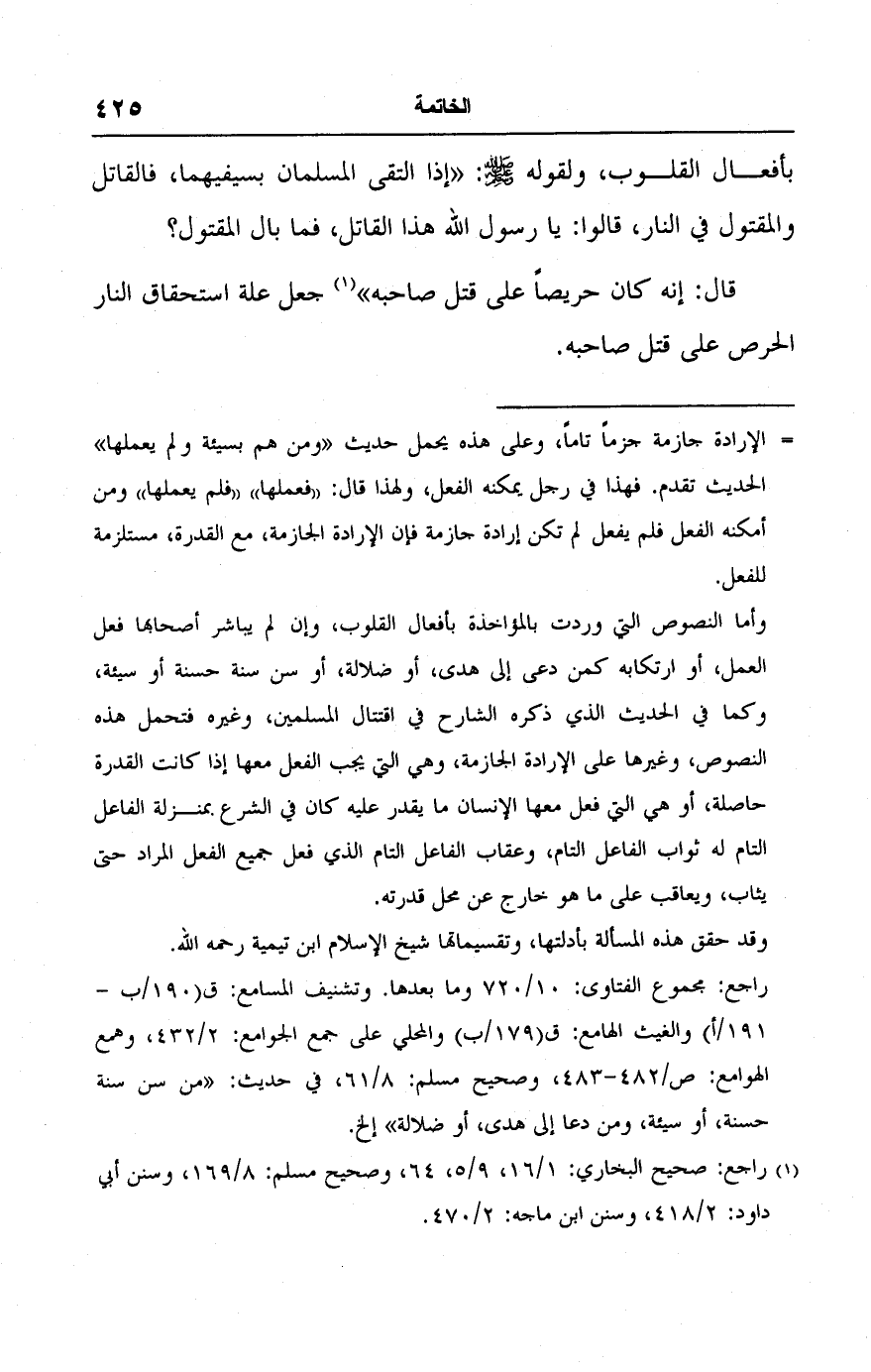 وأما النصوص إلى وردت بالمؤاخذة بأفعال القلوب، وإن لم يباشر أصحابها فعل العمل، أو ارتكابه كمن دعى إلى هدى، أو ضلالة، أو سن سنة حسنة أو سيئة، وكما في الحديث الذي ذكره الشارح في اقتتال المسلمين، وغيره فتحمل هذه النصوص، وغيرها على الإرادة الجازمة، وهي التي يجب الفعل معها إذا كانت القدرة حاصلة، أو هي إلى فعل معها الإنسان ما يقدر عليه كان في الشرع بمنزلة الفاعل التام له ثواب الفاعل التام، وعقاب الفاعل التام الذي فعل جميع الفعل المراد حتى يثاب، ويعاقب على ما هو خارج عن محل قدرته.