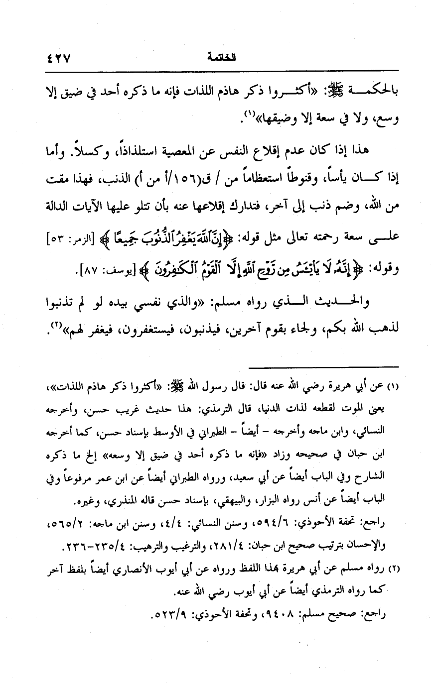 هذا إذا كان عدم إقلاع النفس عن المعصية استلذاذًا، وكسلًا. وأما إذا كان يأسًا، وقنوطًا استعظامًا من الذنب، فهذا مقت من اللَّه، وضم ذنب إلى آخر، فتدارك إقلاعها عنه بأن تتلو عليها الآيات الدالة على سعة رحمته تعالى مثل قوله: {إِنَّ اللَّهَ يَغْفِرُ الذُّنُوبَ جَمِيعًا} [الزمر: ٥٣] وقوله: {إِنَّهُ لَا يَيْأَسُ مِنْ رَوْحِ اللَّهِ إِلَّا الْقَوْمُ الْكَافِرُونَ} [يوسف: ٨٧].
